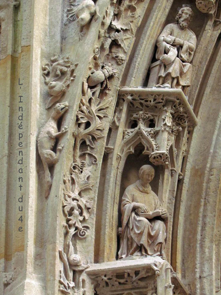 «Deux figures qui représentent la Seine et la Marne, sont à demi-couchées sur les impostes, et sont regardées comme des chefs-d'œuvre de sculpture. Les uns disent qu'elles sont de Maître Ponce et les autres de Jean Gougeon. Ce qu'il y a de plus constant, c'est que leur excellence fit qu'on les conserva lorsqu'en 1660 on rebâtit cette porte.