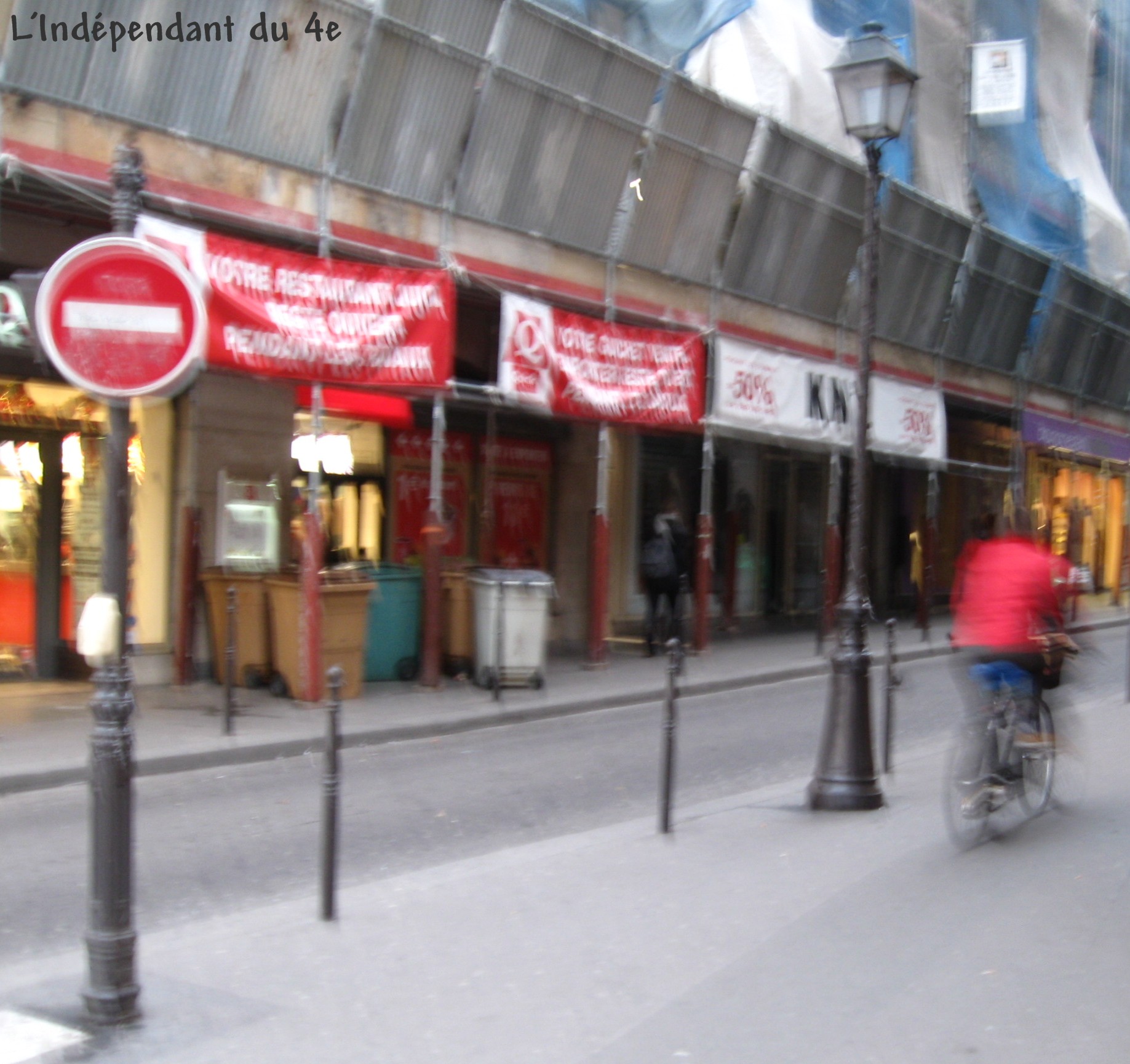 J'ai pris le 11 décembre au matin cette photo un peu floue d'une cycliste qui, après avoir remonté la rue de la Coutellerie à contre-sens et coupé la rue de Rivoli, s'est engagée sur le trottoir de la rue du Temple et en sens interdit... La photo est floue car je ne tiens pas à ce que cette jeune femme anonyme (et inconsciente) puisse être reconnue.