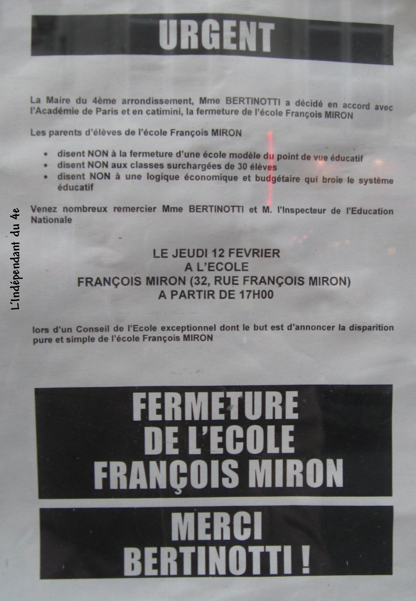 Lors du Conseil d'arrondissement du 2 mars 2009, Vincent Roger, le "leader" de l'opposition municipale a posé une question relative à la fermeture annoncée de l'école maternelle François Miron.