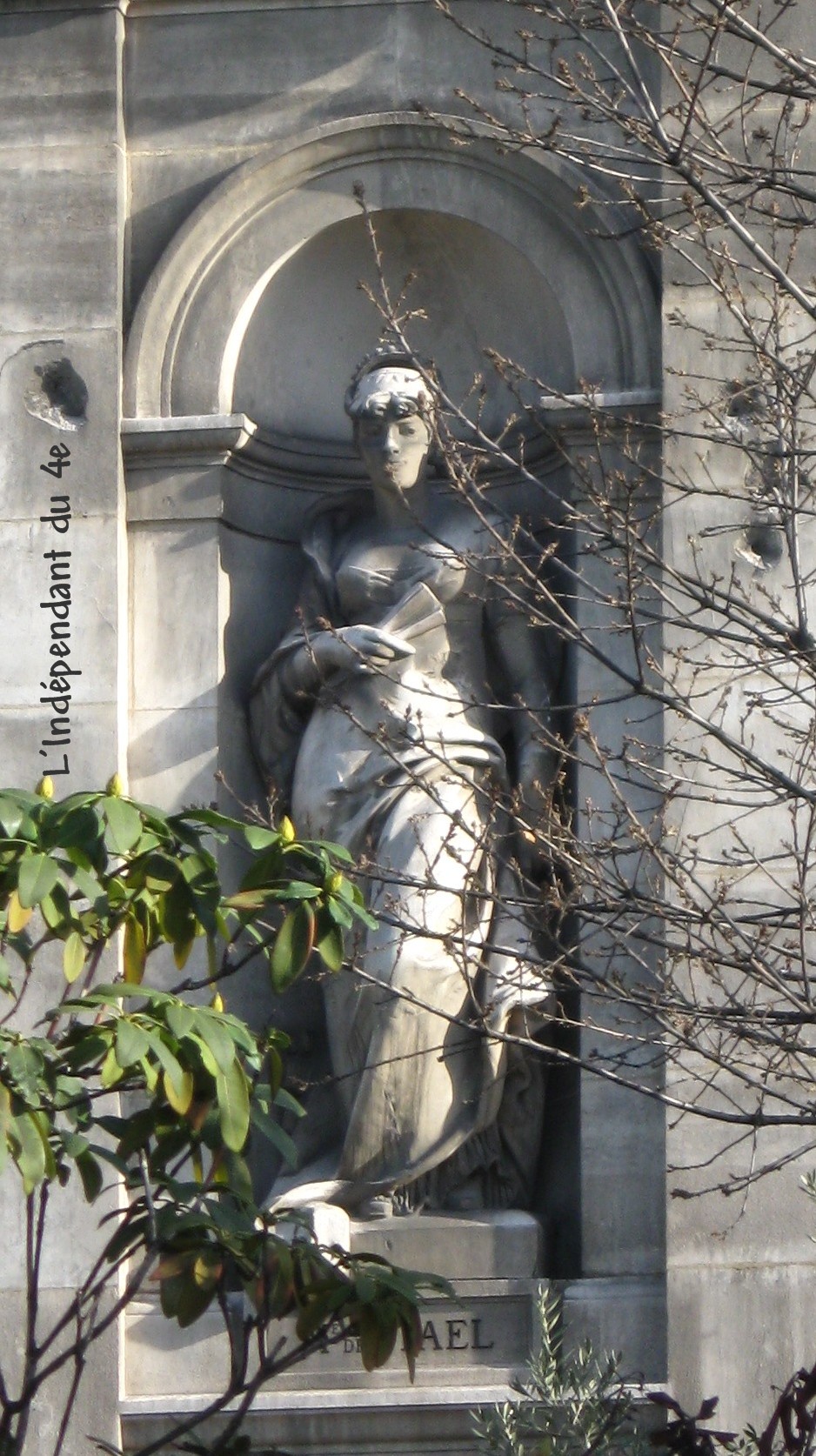 Voici le 36e épisode des statues de l'Hôtel de Ville. Elle concerne une statue qui a dû beaucoup souffrir comme le montre les impacts situés de chaque côté. -Certainement un legs des combats dans Paris en août 1944 (ce ne peut pas être la Grosse Bertha qui en 1918 lançait des obus sur Paris depuis le Nord)-. De plus, cette statue est peu visible car elle est masquée par des arbres et elle est située au 1er étage côté Seine (dans la partie où se trouve l'accès à la crèche créée par Bertrand Delanoë). Dommage que l'on ne la voit pas mieux que cela car elle représente la 2e femme depuis le début de cette série (après Mme Geoffrin qui est située juste à droite au même niveau mais que, elle, on peut voir depuis la rue). Elle représente une grande femme de lettres à la vie tourmentée : Madame de Staël