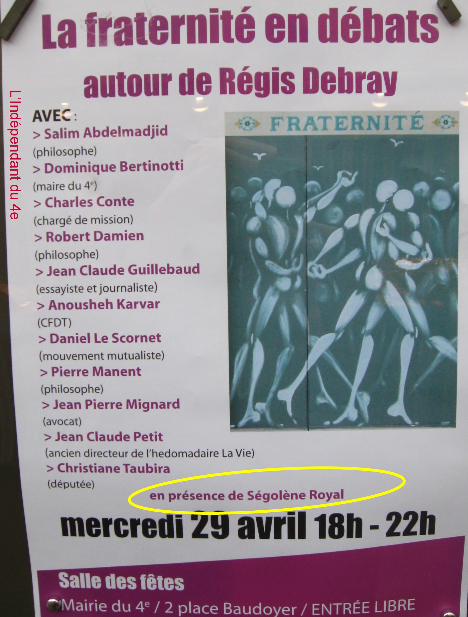 A ma grande surprise, j'ai constaté qu'en langage ségoléniste, "présence" et "présidence" étaient synonymes puisqu'après une brève introduction par notre maire du 4e arrondissement, Dominique Bertinotti, c'est Mme Royal qui est venue présenter cette soirée consacrée à la "fraternité".