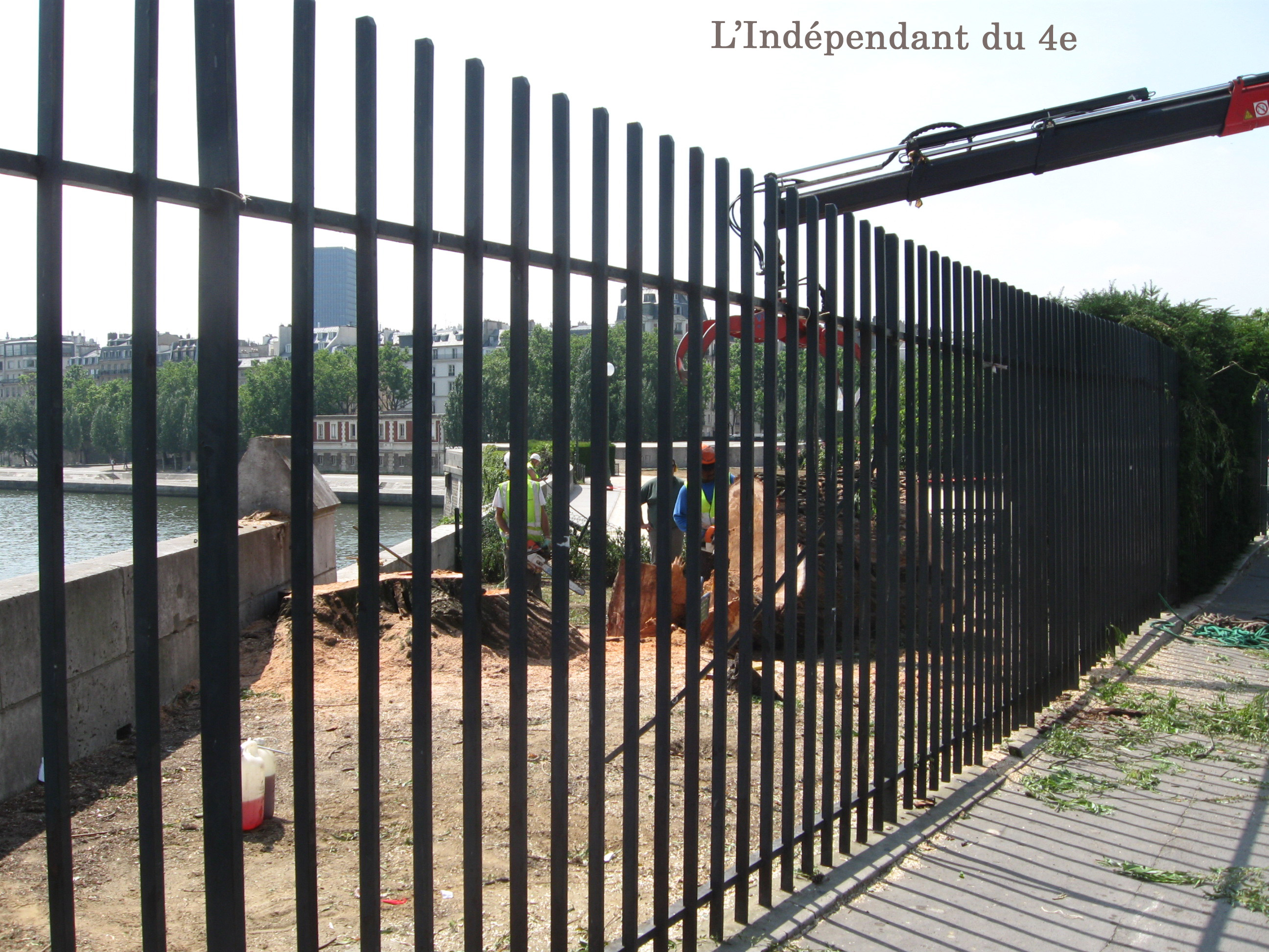 L'important est que cet article du Parisien nous a permis d'apprendre que, d'après la maire du 4e, Dominique Bertinotti, cet arbre menacait la sécurité des bateaux et... des "promeneurs du square" (sic). Pour le danger sur la navigation je veux bien mais par contre pour les dits promeneurs je ne vois pas où était le danger : l'arbre était protégé par un muret avec un petit grillage dans l'angle du parc, et le long de la rue, il était placé derrière des grilles :