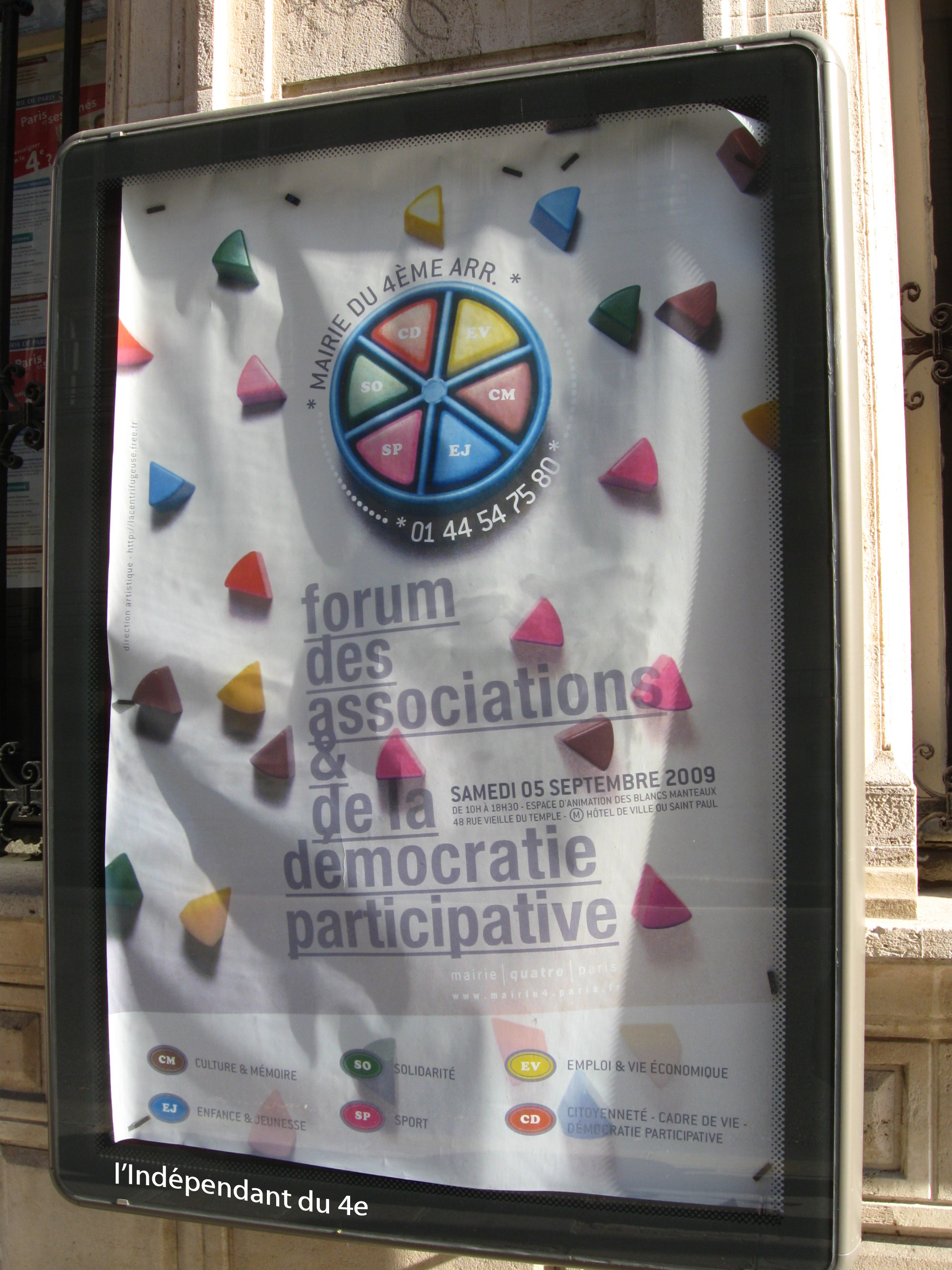 Le forum des associations du 4e se tiendra samedi 5 septembre prochain. Il regagne cette année l'Espace-des-Blancs-Manteaux-Pierre-Charles-Krieg après s'être tenu à la mairie du 4e arrondissement en 2008.