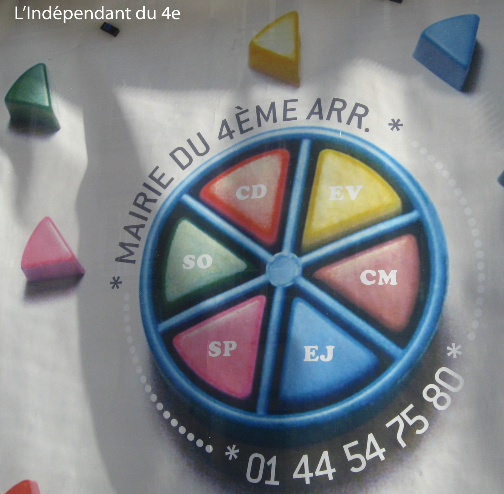 Cette affiche me conduit finalement à quelques interrogations. En effet, elle s'inspire très clairement du design du jeu Trivial poursuit mis au point en 1979 par Chris Haney et Scott Abbott et que j'ai beaucoup pratiqué dans ma jeunesse. (J'en ai encore un exemplaire dans un de mes placards.) Cependant je me demande si la mairie du 4e arrondissement a payé la société américaine Asbro qui commercialise Trivial Poursuit pour avoir le droit d'utiliser un design inspiré de ce jeu. Dans ce cas, on pourrait varier les jeux d'une année sur l'autre... Je suggère une marelle !