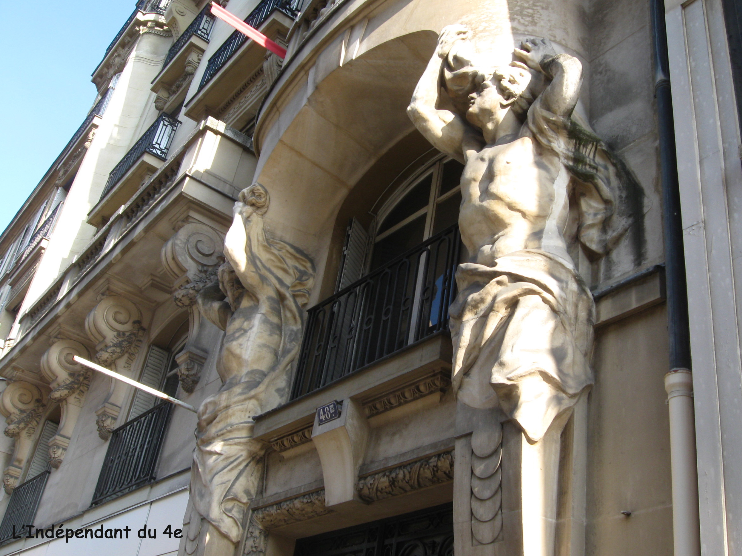 Au 48 bis, de la rue de Rivoli on trouve une façade avec deux superbes atlantes, c'est-à-dire des bustes de statue masculine qui servent de support à un élément architectural placé au dessus (pour les statues féminines, on parle de cariathides).. A gauche, il s'agit d'un vigoureux jeune homme :