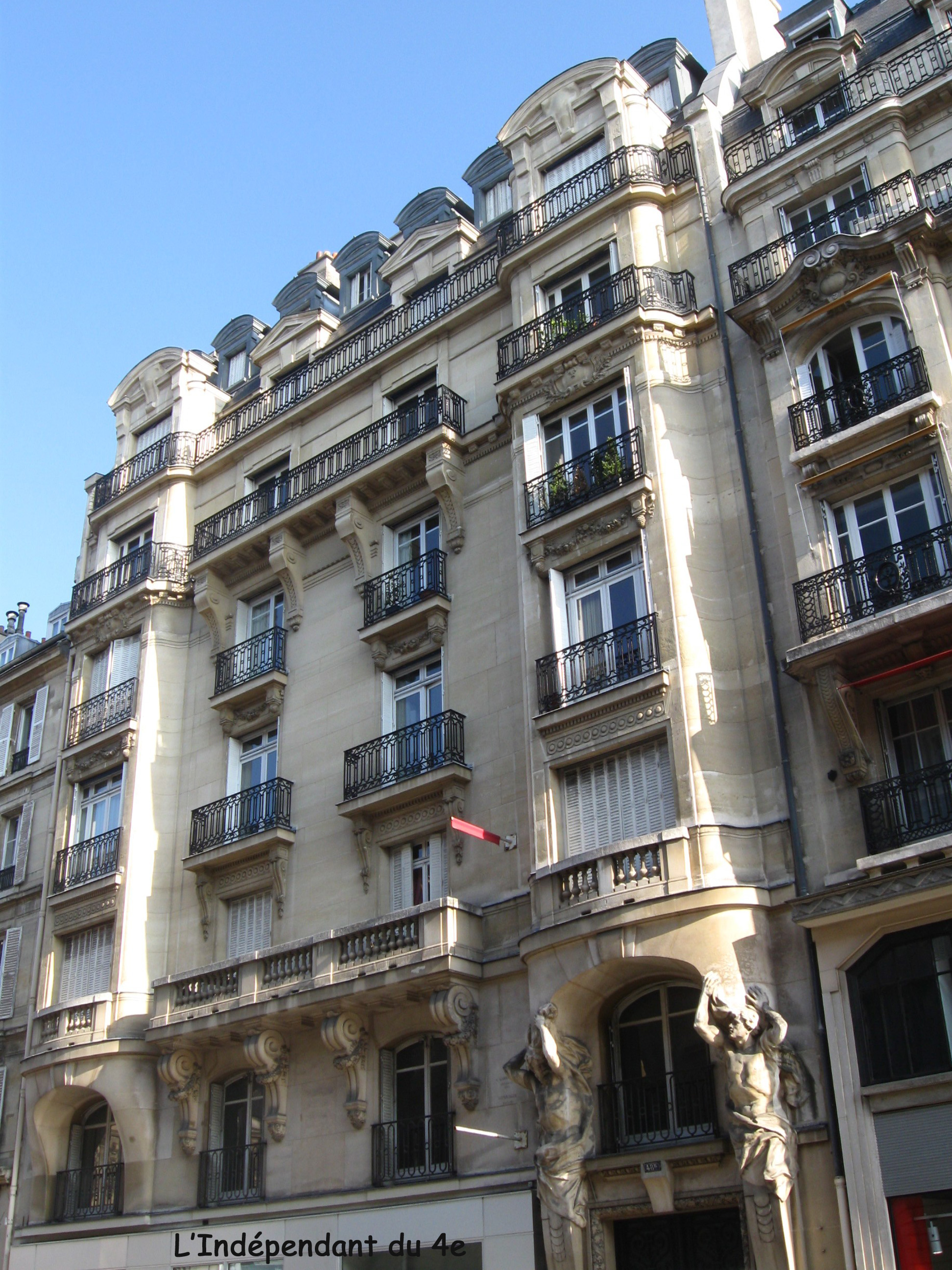 Ces deux atlantes sont un peu surprenants sur cet immeuble car il date du début du XXe siècle. Le goût pour les reprises "à la manière de" date plutôt du XIXe siècle. De plus, le reste de la façade est pour les reste assez sobre surtout si on le compare avec les surprenants immeubles en style "art nouveau" que l'on construisait à la même époque (voir par exemplel'article du 6 novembre 2008 à propos du 21 rue de la Verrerie qui a été construit au même moment). Les éléments en forme de disques empilés situés sous les deux atlantes ont même design qui annonce le style art déco qui triomphera dans la décennie suivante.