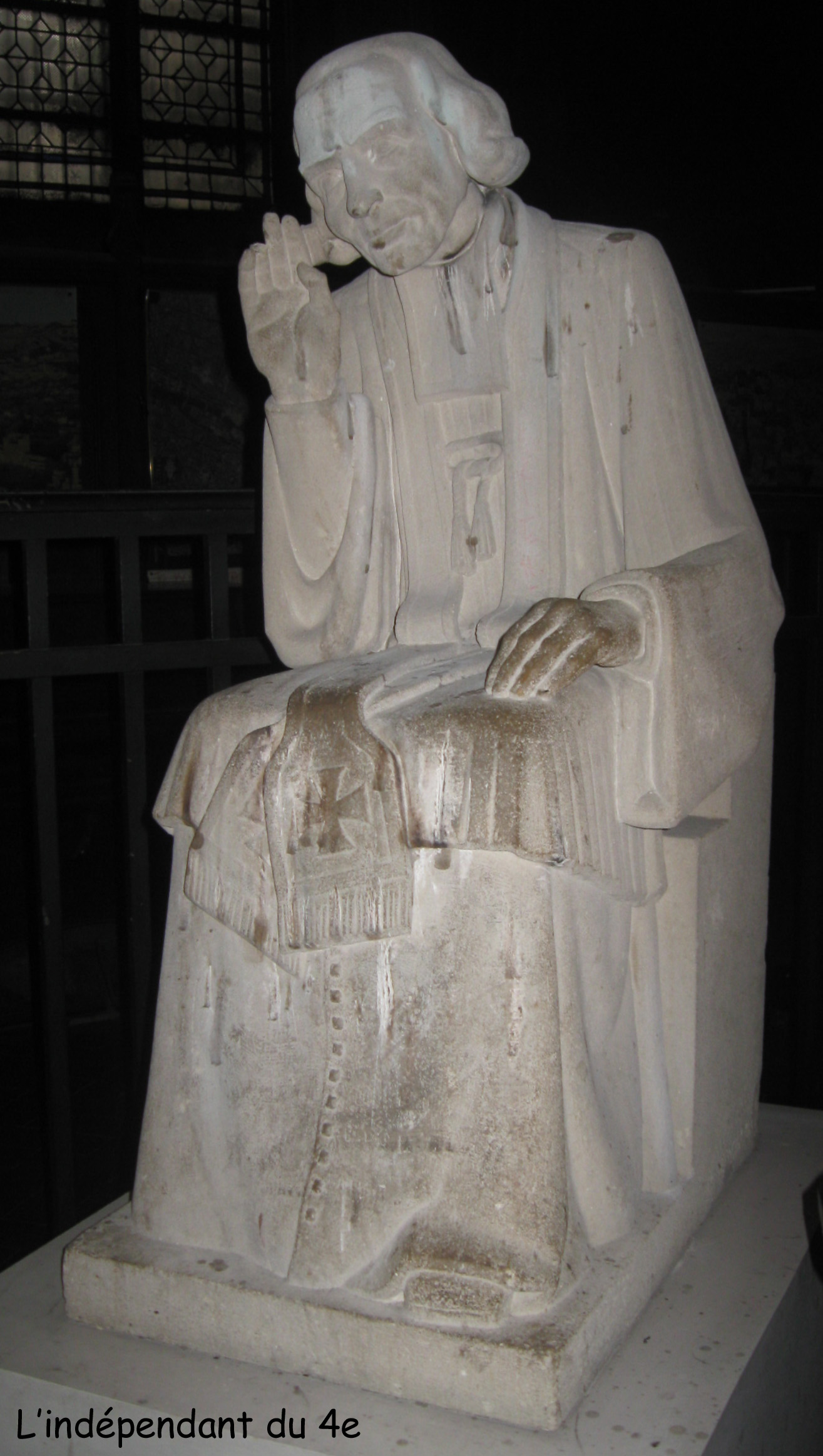 D'après le commentaire qu'elle a laissé cette statue représente Jean-Marie VIANNEY (1786-1859) dit le Saint-Curé d'Ars. Ce personnage de grande foi est un représentant de la reconquête catholique après les temps difficiles pendant la Révolution française. Le curé d'Ars a été canonisé en 1925. Il est le saint-patron de tous les curés. J.-M. Vianney est représenté au moment où il entendait un fidèle en confession qui, pour lui, était une des tâches primordiales du rôle des prêtres.