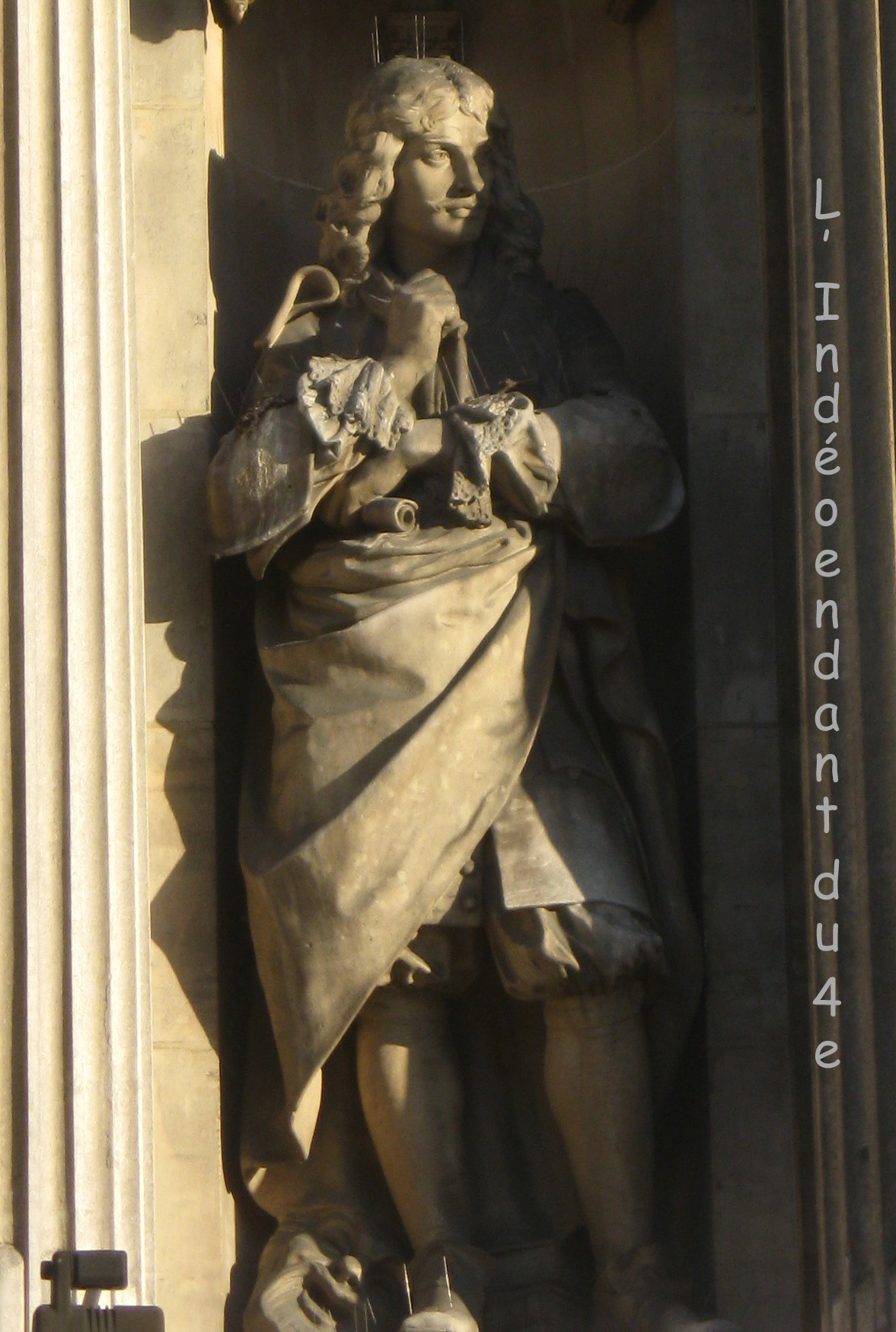 Voici le 64e volet de la série des statues de l'Hôtel de Ville. Elle concerne le parisien qui est peut-être le plus connu de tous : Molière. La statue est située à gauche du portail le plus souvent utilisé pour entrer dans le bâtiment depuis la place, celui situé à gauche du pavillon central :