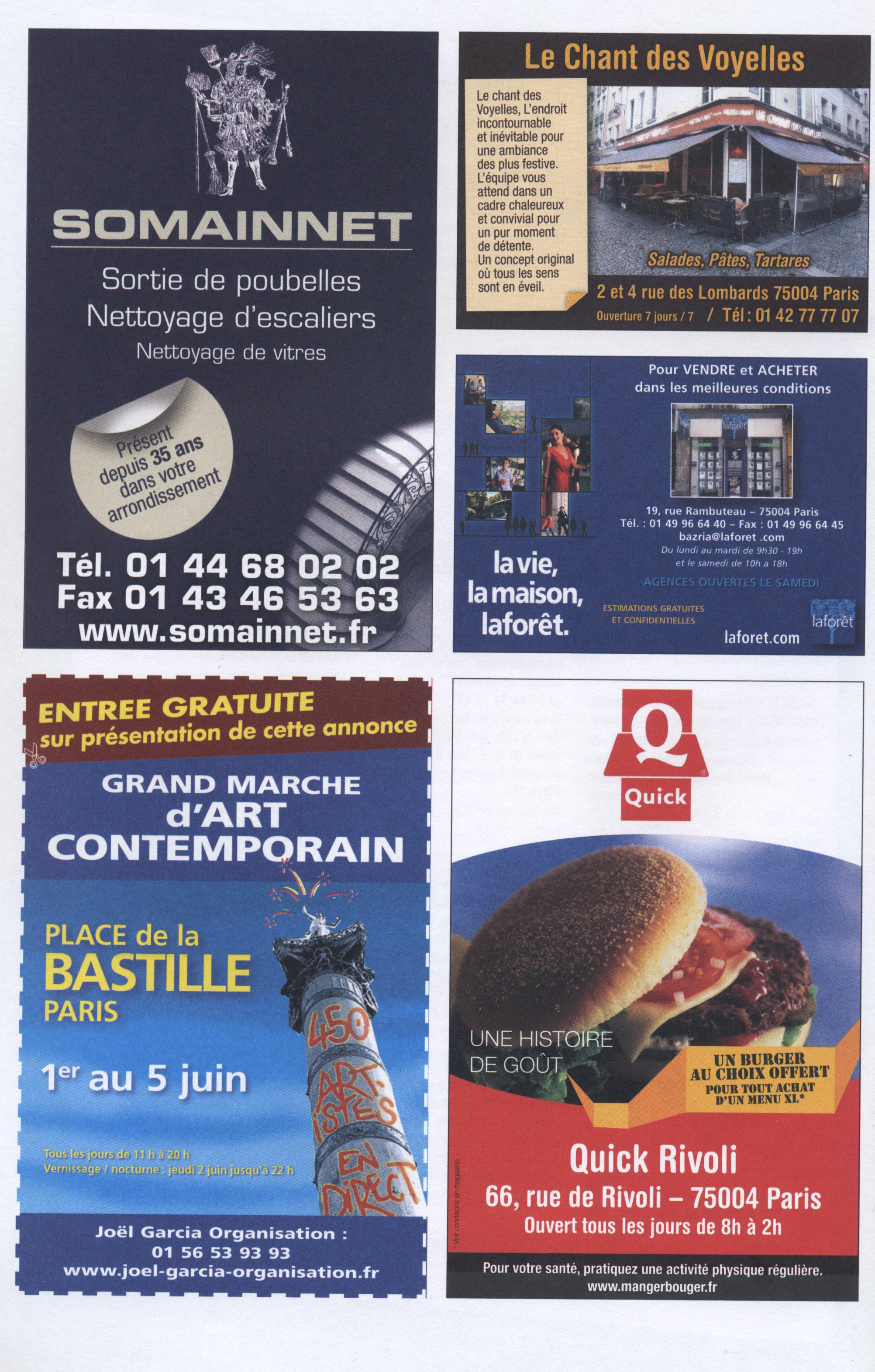 Sans tomber dans la dénonciation trop facile du fast food, on peut se demander si la présence de ce "burger" dans une revue qui est distribuée dans toutes les installations municipales du 4e est bien opportune... L'uniformisation commerciale du 4e arrondissement en est-elle arrivée à un tel point que la mairie se voit contrainte de faire passer dans son journal d'information locale ce genre de publicité, faute d'autres annonceurs ?