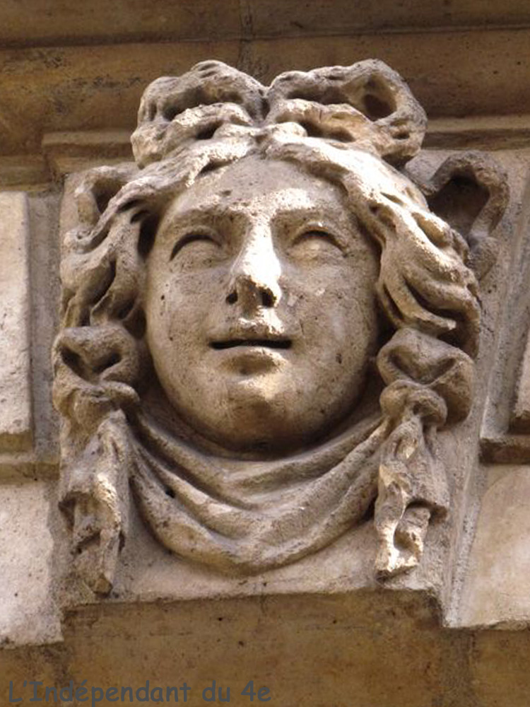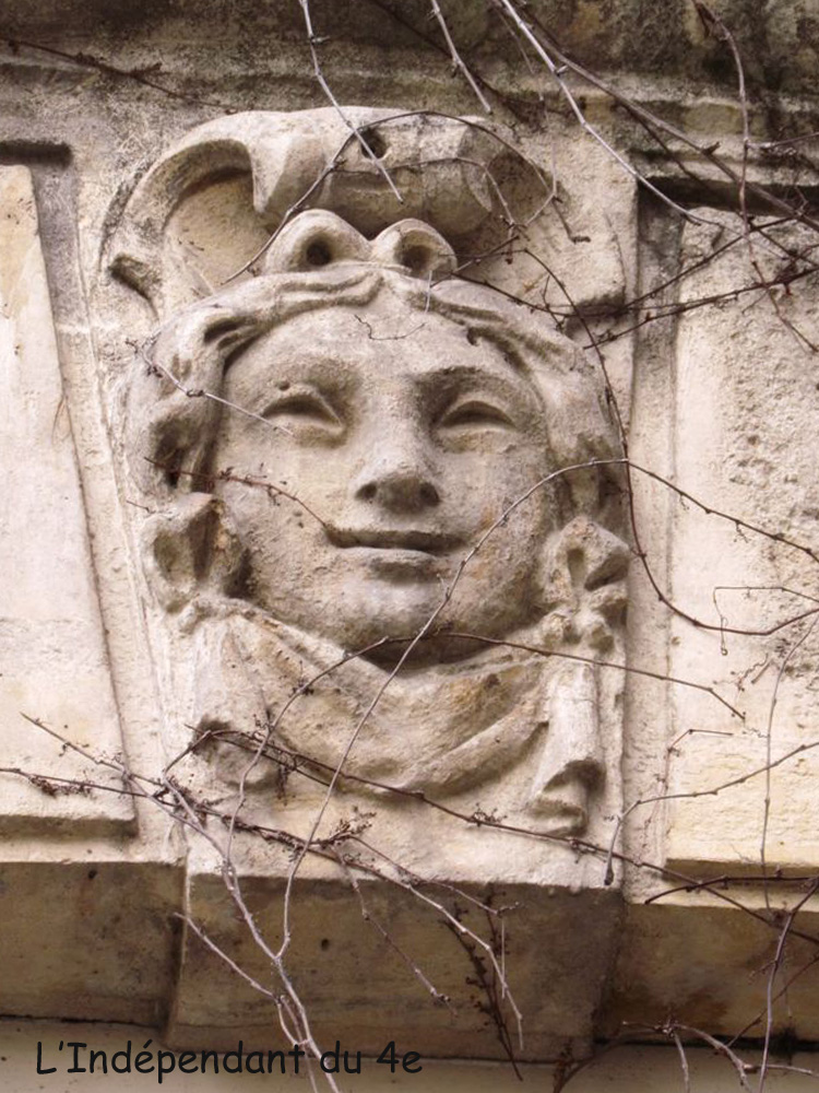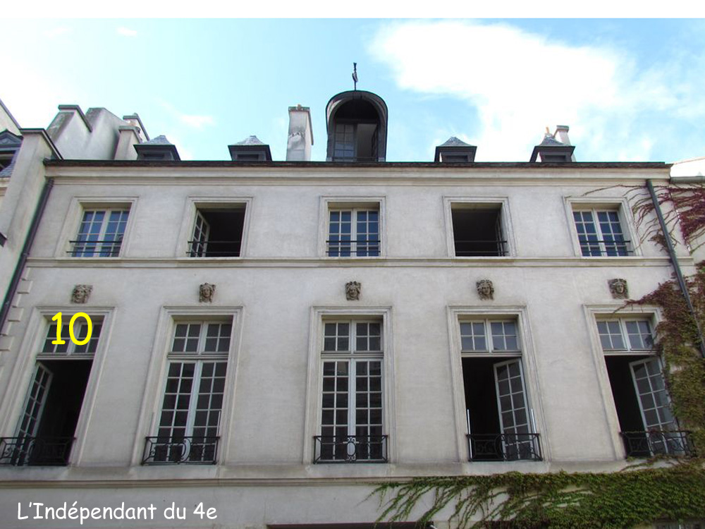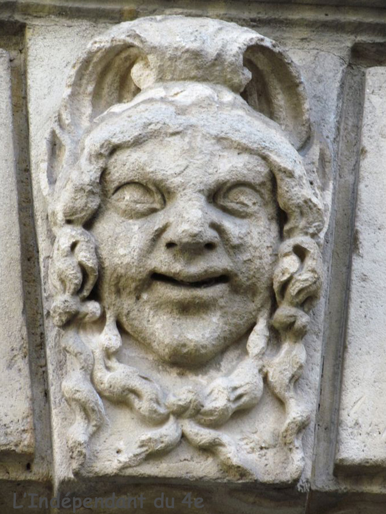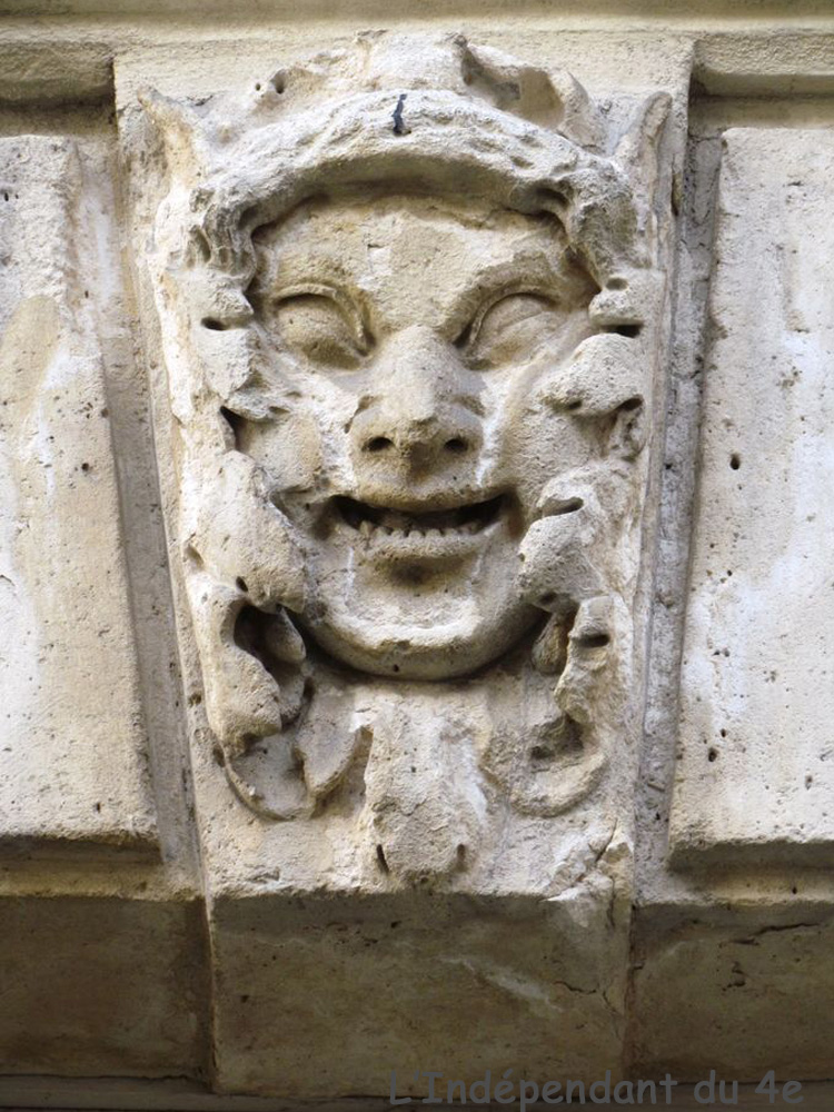 Les 5 mascarons de la façade de l'immeuble situé entre la Cour d'Honneur et la rue (Geoffroy l'Asnier) avec l'emplacement du mascaron n°10.