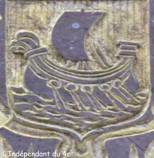 Voici un nouvel épisode de la série consacrée aux représentations de la nef de Paris dans le 4e arrondissement. J'ai écrit, il y a quelques semaines, un article à propos de la galère qui figure à l'entrée de l'école de la rue du Fauconnier (article du 3 septembre 2011). En continuant cette série, je me rends compte que la représentation d'une galère dans les armoiries n'est pas si rare. Elle est certes très éloignée de la nef représentée sur le sceau des marchands d'eau de Paris au XIIIe siècle (voir article du 13 octobre 2011) mais il semble que cela corresponde à une mode du XIXe siècle. En effet, on retrouve une autre galère sur la plaque située à l'entrée du lycée Sophie Germain.