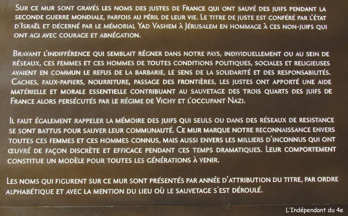 Ce mur nous rappelle ainsi que dans les heures sombres du régime de Vichy et de l'Occupation nazie, des Françaises et des Français ont risqué leur vie pour sauver des Juifs qui étaient menacés. Que cette belle leçon de courage et d'engagement pour les valeurs qui fondent la République servent de modèle !