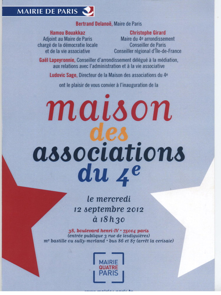 Demain mercredi 12 septembre 2012 à 18h30 aura lieu "l'inauguration de la Maison des Associations du 4e" au 38, boulevard Henri IV.
