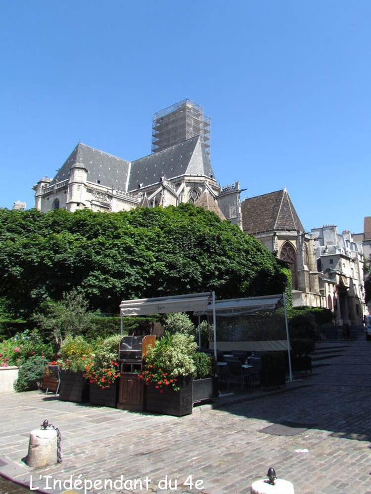 En continuant dans cette rue vers l'Est, on arrive après à la hauteur de la rue des Barres avec la superbe vue sur le chevet de l.'église Saint-Gervais-Saint-Protais (et son affreux échafaudage depuis 2012) :