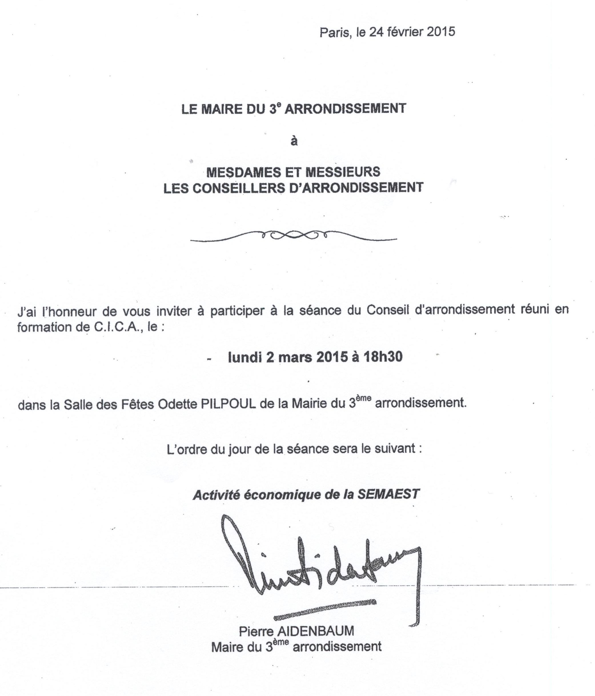 5°) Quitte à s'appuyer sur l'expérience que l'on a dans l'arrondissement où on possède sa résidence (ou au moins l'une d'elles), j'invite M. Girard à s'intéresser à ce qui se passe dans le 3e arrondissement. Le 2 mars 2015, le maire du 3e, M. Aidenbaum avait justement convoqué à 18h30 une réunion du Conseil d'arrondissement élargi en CICA (voir la convocation ci-dessous). Les échos que j'ai eu de la part d'un président d'association qui y a participé m'ont confirmé que les échanges peuvent y être l'objet d'un débat intéressant et constructif.