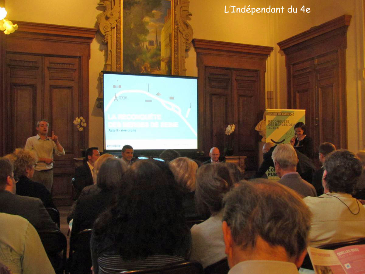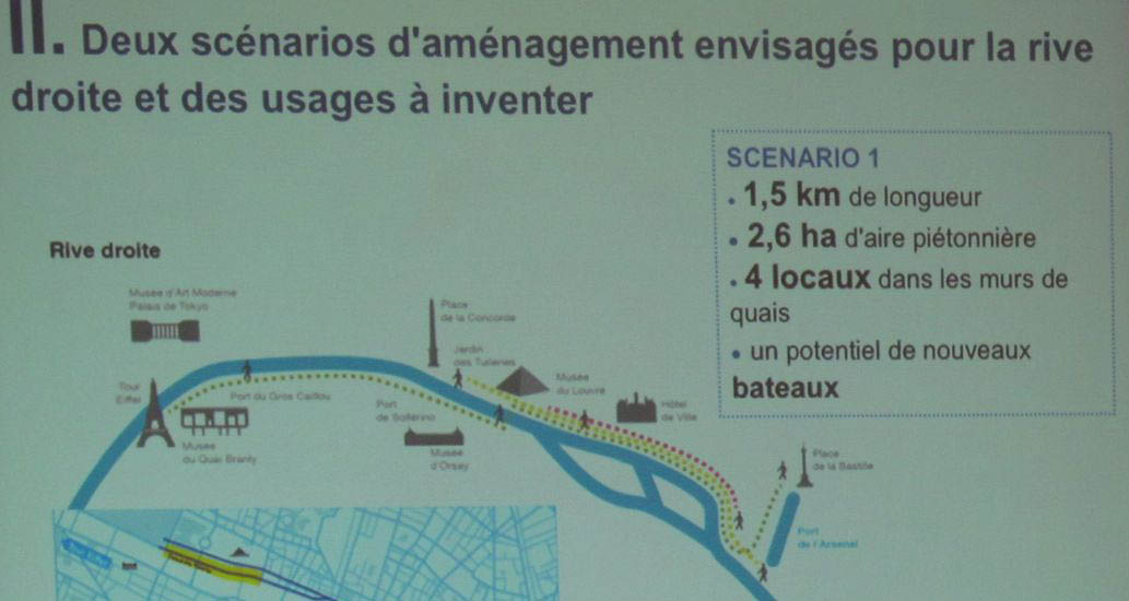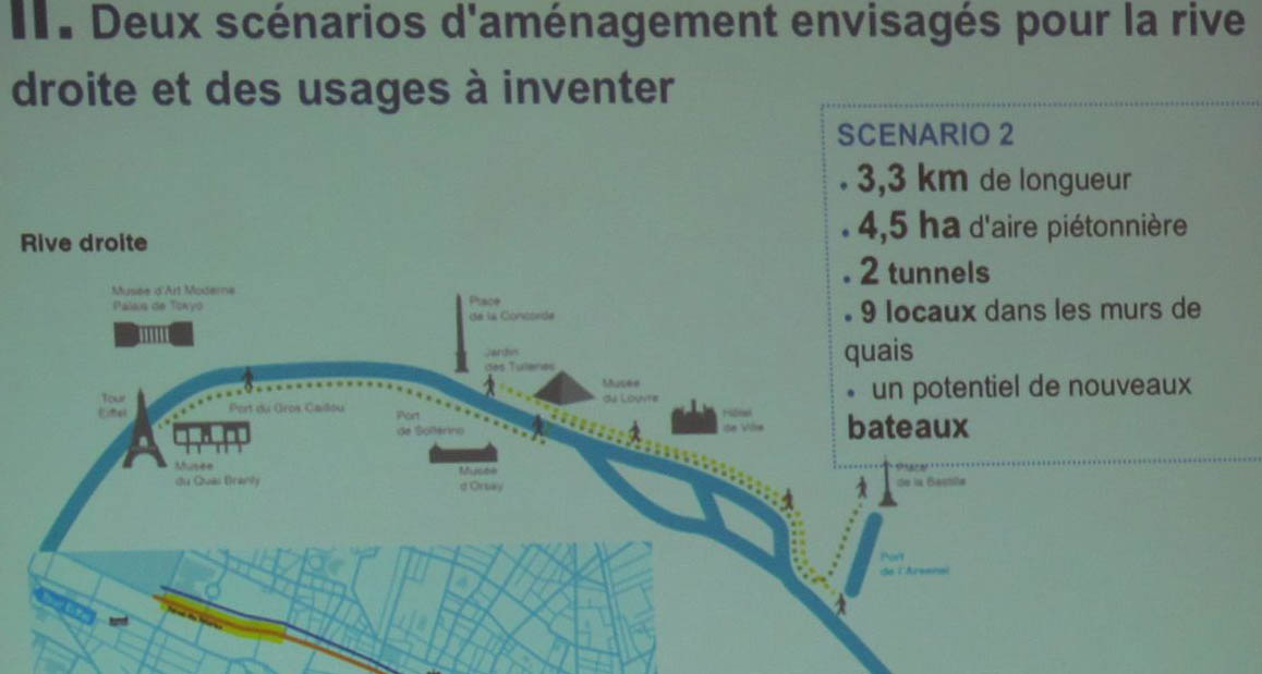 Lors de cette réunion, trois élus ont pris la parole pour introduire le sujet : Christophe Girard (maire du 4e), Christophe Najdovski (adjoint EELV de la maire de Paris, en charge des transports, de la voierie et de l'espace public) et Jean-Louis MISSIKA (adjoint PS de la maire de Paris en charge de toutes les questions relatives à l'urbanisme, l'architecture, aux projets du Grand Paris, au développement économique et à l'attractivité). Puis, Xavier Janc en charge du projet d'aménagement de la rive droite a présenté le dossier.