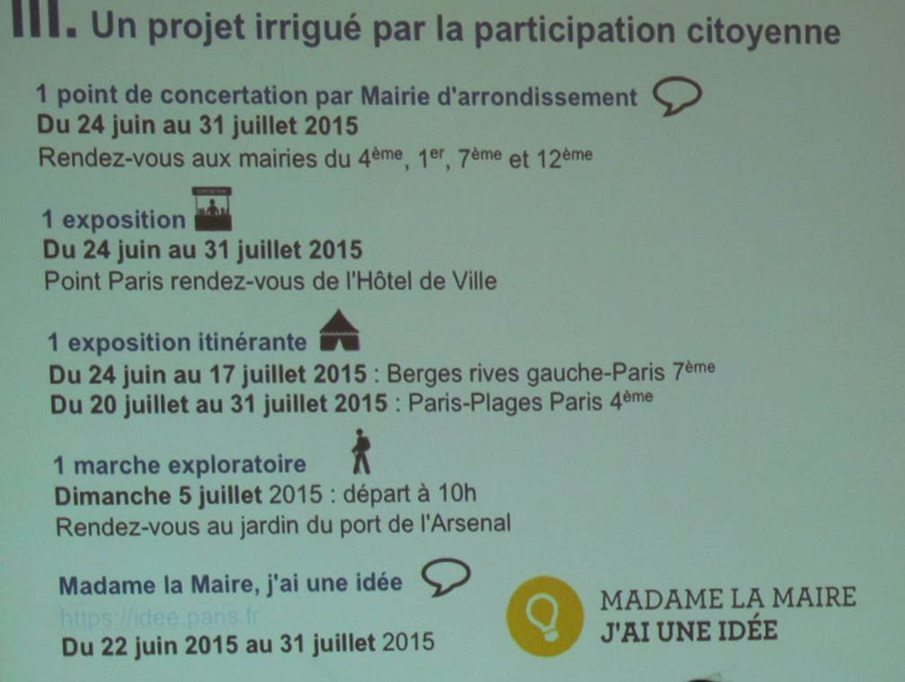 Mardi 23 juin 2015, j'ai assisté à la réunion d'information à la mairie du 4e sur l'aménagement des berges de la rive droite. Nombre de mes amis ne pouvaient pas y assister car ils avaient d'autres obligations lors de cette soirée (réunion de solidarité avec les Chrétiens d'Orient au Cirque d'Hiver ou élection du président de la Fédération de l'UDI du 4e au siège du parti dans le 15e). D'autres ont décidé de refuser d'assister à ce genre de réunion car ils considèrent qu'il s'agit d'une mascarade participative. Tel n'est pas mon cas, car depuis des années, j'ai toujours tenu à y assister pour deux raisons :