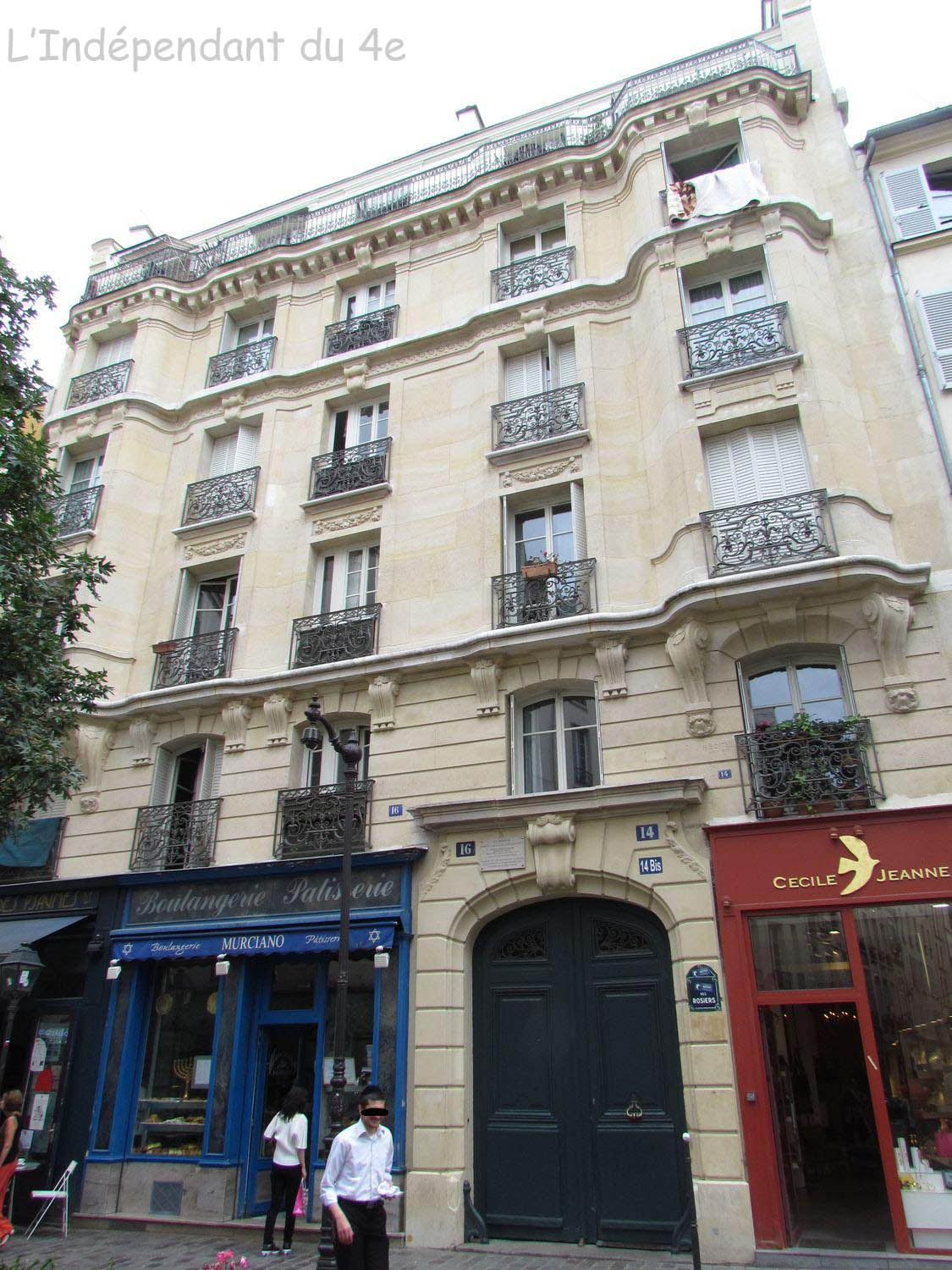 La rue des Rosiers est une voie ancienne du 4e. On y trouve des façades d'époque très diverses. Au 14/14bis, on peut observer une façade élégante du début du XXe siècle. Elle est datée de 1907 et signée par l'architecte H. Boitel.