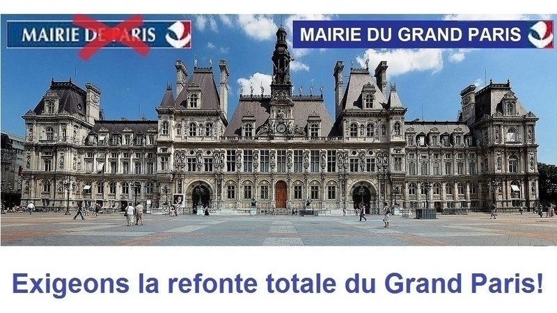 - La suppression de la Mairie de Paris, de la Métropole du Grand Paris, des Établissements Publics Territoriaux, du Conseil de Paris et des départements 92, 93 et 94 et leur remplacement par une Mairie du Grand Paris sur le modèle du Grand Londres qui a été mis en place avec succès et sans difficultés en Grande Bretagne.