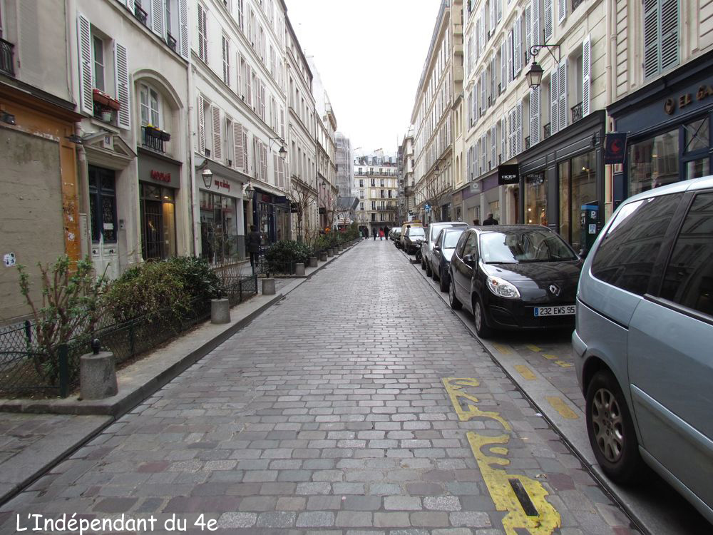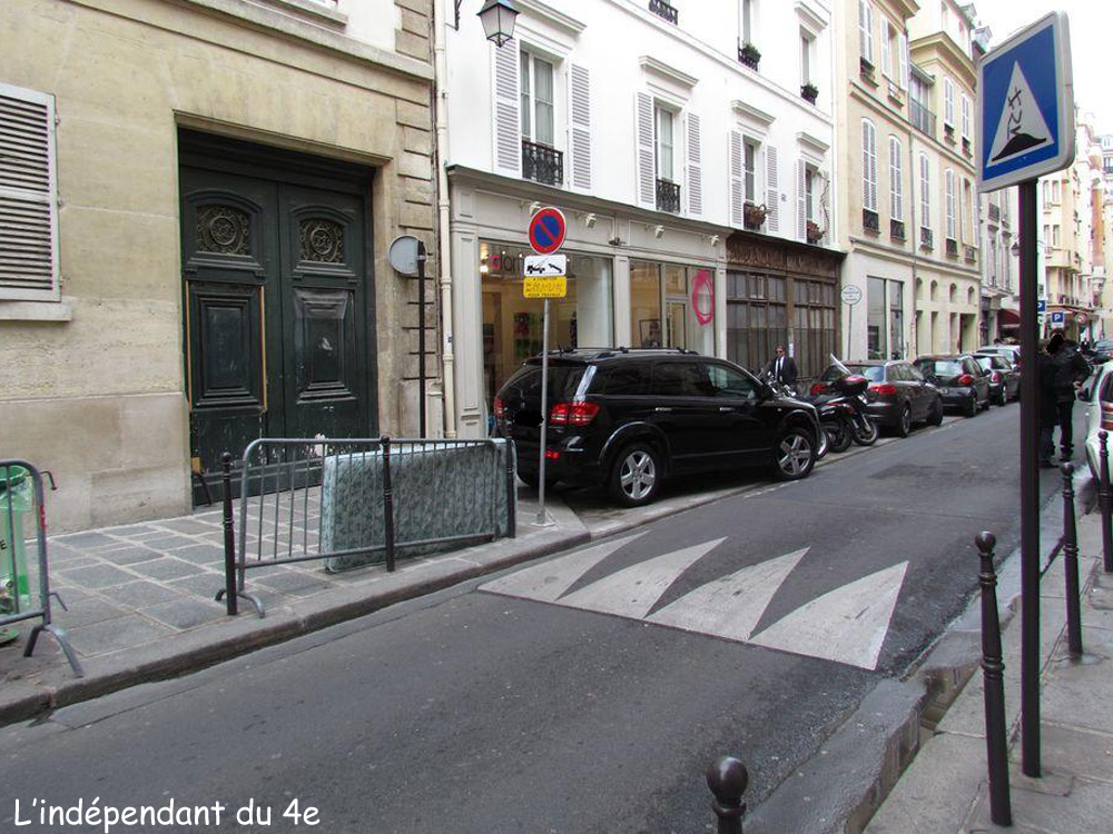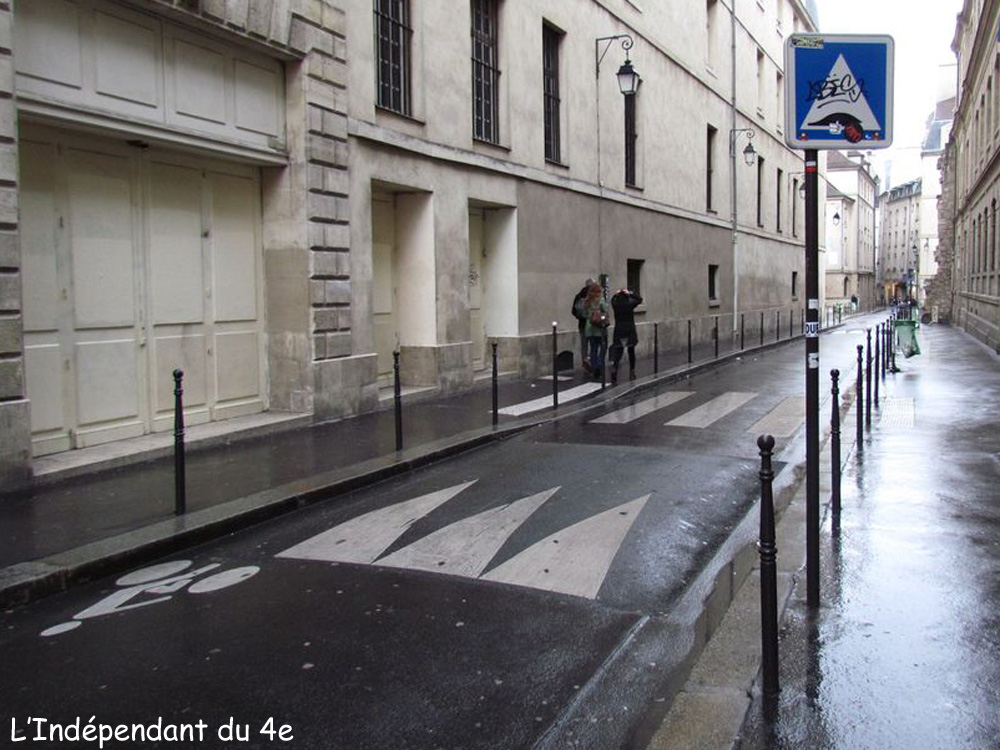 - 1°) La maire du 4e arrondissement, Dominique Bertinotti, a répondu que ce n'était pas possible car le ralentisseur serait un obstacle pour les personnes à mobilité réduite et... pour les poussettes. Elle a donc semblé ne pas comprendre que le ralentisseur souhaité devait être installé dans la partie de la rue où normalement les piétons peuvent circuler... sur les trottoirs. Dans cette partie de la rue la chaussée centrale est réservée aux voitures :