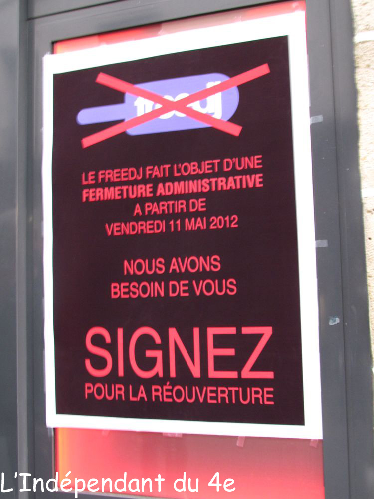 Nouvel ADDENDUM le 12 mai 2012 à 17h15... Finalement, la décision de fermerture administrative a bien été prise. Elle est affichée sur la porte du Freedj depuis ce matin (voir la photo que j'ai prise ci-dessous). Une personne m'avait envoyé un mail hier pour me dire que l'information relative à la fermeture était fausse et que donc j'avais été manipulé. Voilà en tout cas une preuve cinglante que ce n'était pas Frédéric Hervé dans cette affaire qui faisait de la "désinformation" comme on me l'avait écrit.