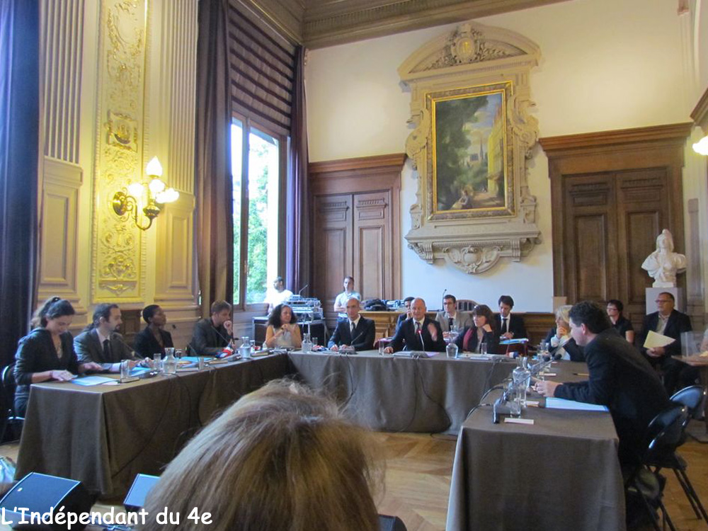 Séance du Conseil d'arrondissement du 13 avril 2014 (autour de la table de Gauche à Droite : Vincent Roger, Martine Weil-Reynal, Boniface N'Cho, Julien Landel, Christophe Girard, Karen Taïeb et de dos Corine Faugeron, Ariel Weil et Anne Lebreton)