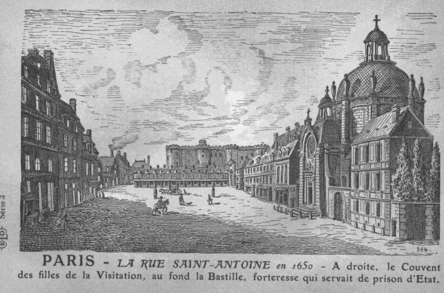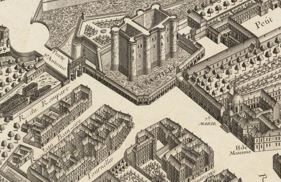 Sur celle-ci on peut voir la Bastille et la "Porte Saint-Antoine" qui marquait l'entrée dans le Centre de Paris à l'emplacement de l'enceinte de Charles V détruite pendant le règne de Louis XIV.