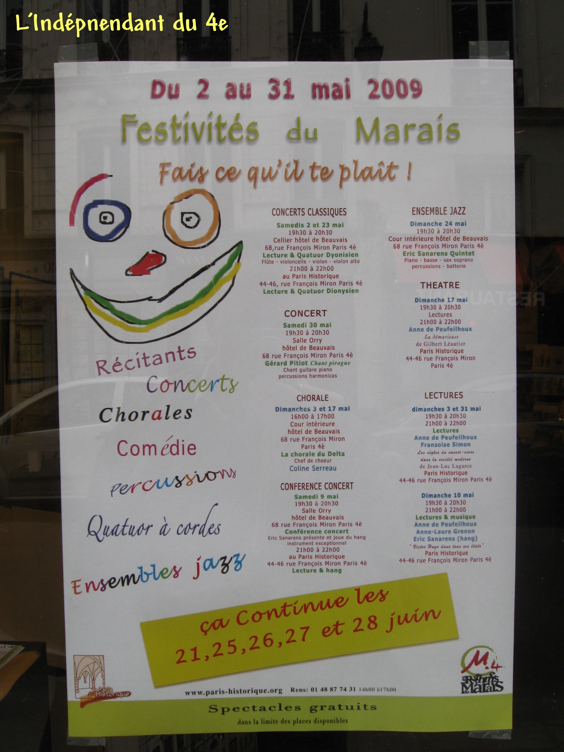 L'édition 2009 des festivités du Marais (qui sont une magnifique manifestation culturelle qui se tient depuis des années) est interdite de séjour dans les rues et places du 4e, au prétexte (paraît-il) qu'il y a déjà trop d'animations sur la voie publique. Les festivités du Marais se sont donc tenues cette année dans les hôtels particuliers et dans des lieux privés et elles n'ont pas eu droit à un affichage officiel... (Ils devraient faire venir Ségolène Royal, c'est un moyen très utile pour cela)... Or, les festivités du Marais sont organisées par l'association Paris historique qui a osé critiquer "l'audace architecturale" (pour reprendre une expression de la maire) de la façade du logement social rue de Turenne. Faut-il y voir une relation de cause à effet ? On n'ose penser que la municipalité s'abaisserait à un tel sectarisme... (article du 14 mai 2009)