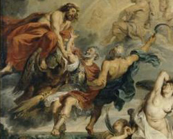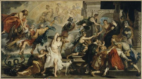 Voici un détail d'un tableau que j'aime montrer à mes élèves de 4e chaque année quand je me rends au Louvre avec eux dans le cadre d'un projet histoire de la peinture. On y voit Henri IV emporté au ciel par la mort tandis que sa femme Marie de Médicis est proclamée régente. Ce tableau se trouve au Louvre dans la magnifique salle consacrée aux peintures faites par Rubens pour raconter l'histoire de la régente.
