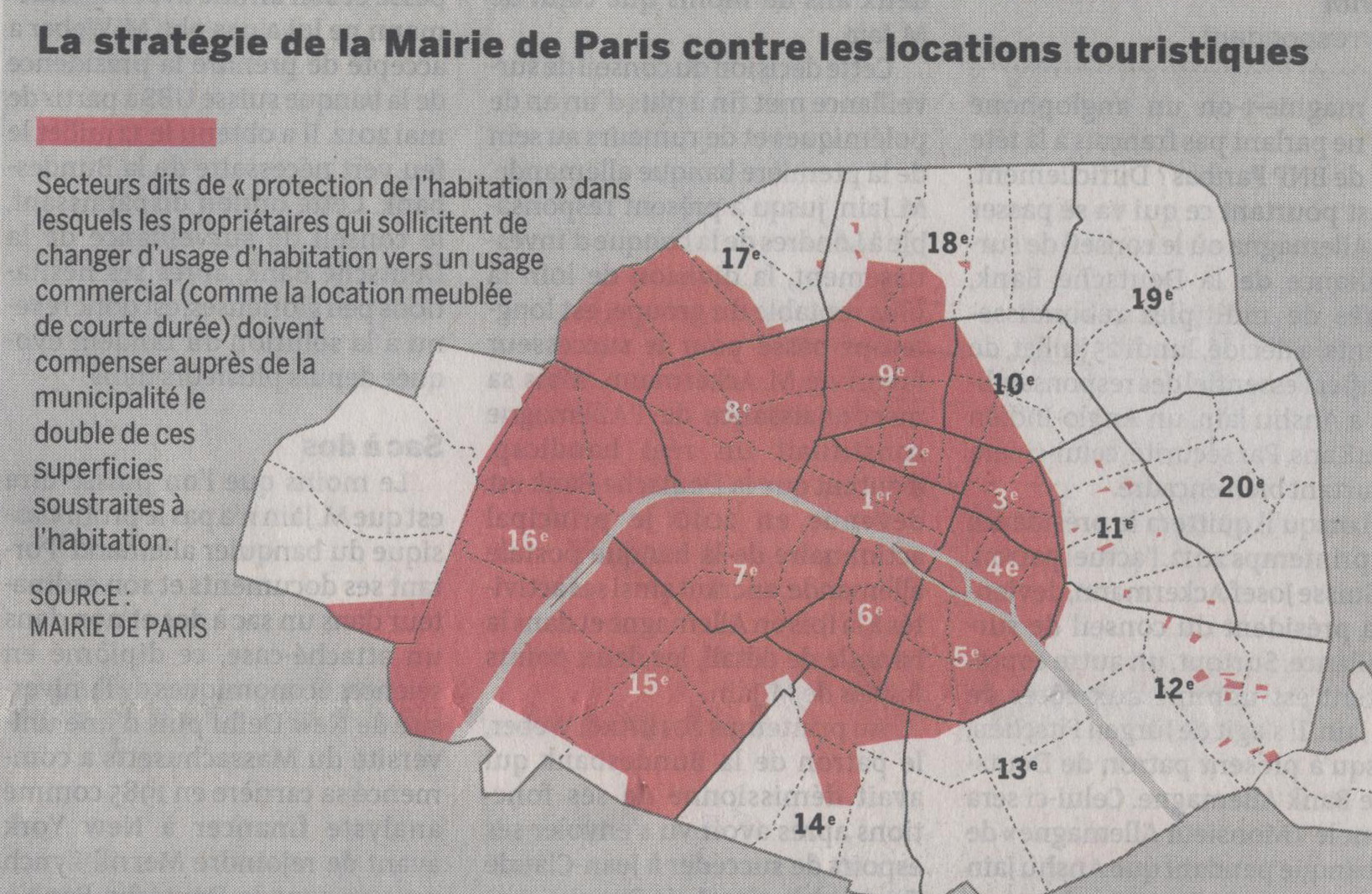 - la réglementation a changé : désormais tout propriétaire qui met un logement en location saisonnière doit compenser cela en transformant une surface équivalente espace commercial en logement dans la même zone résidentielle (et non plus n'importe où ailleurs dans Paris).