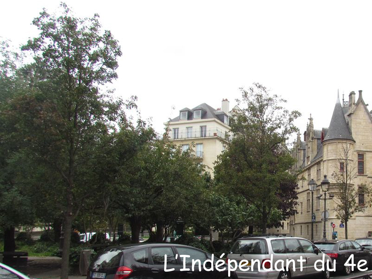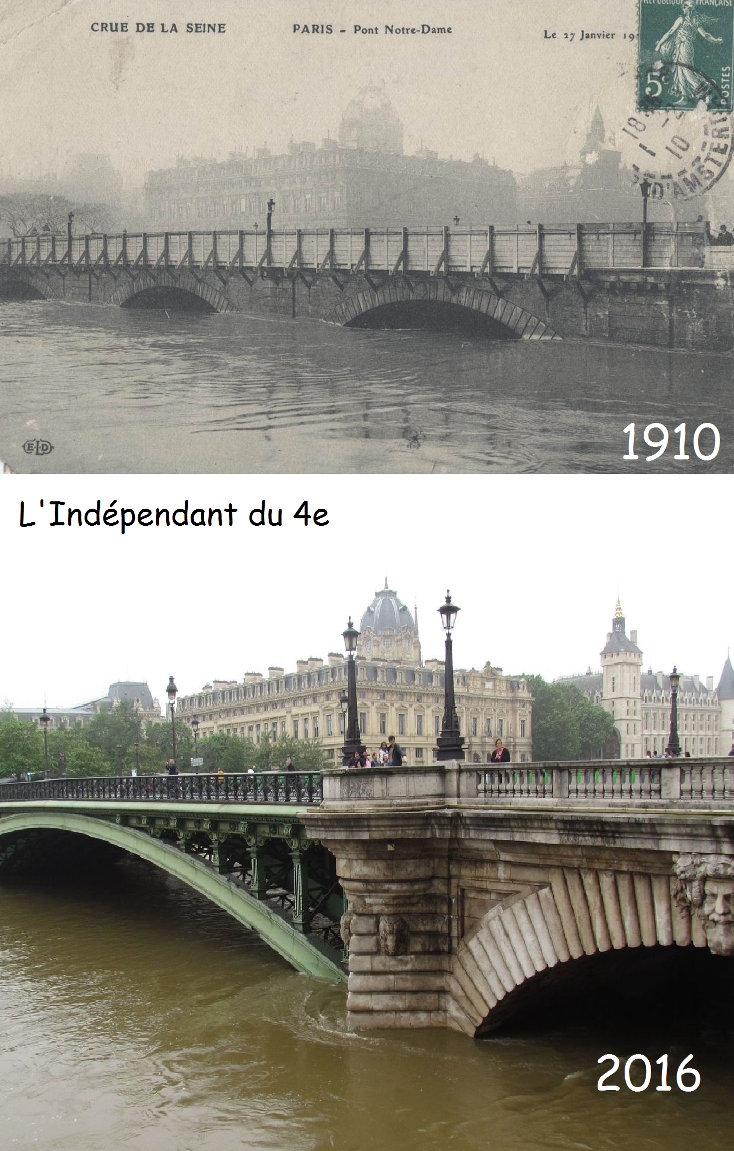 La vue est prise depuis le quai de l'archevêché en direction de l'Île Saint-Louis. La vue est méconnaissable depuis puisque le bâtiment que l'on peut voir a été remplacé par un jardin, le square de l’Île de France dont on voit la haie et la grille séparative.