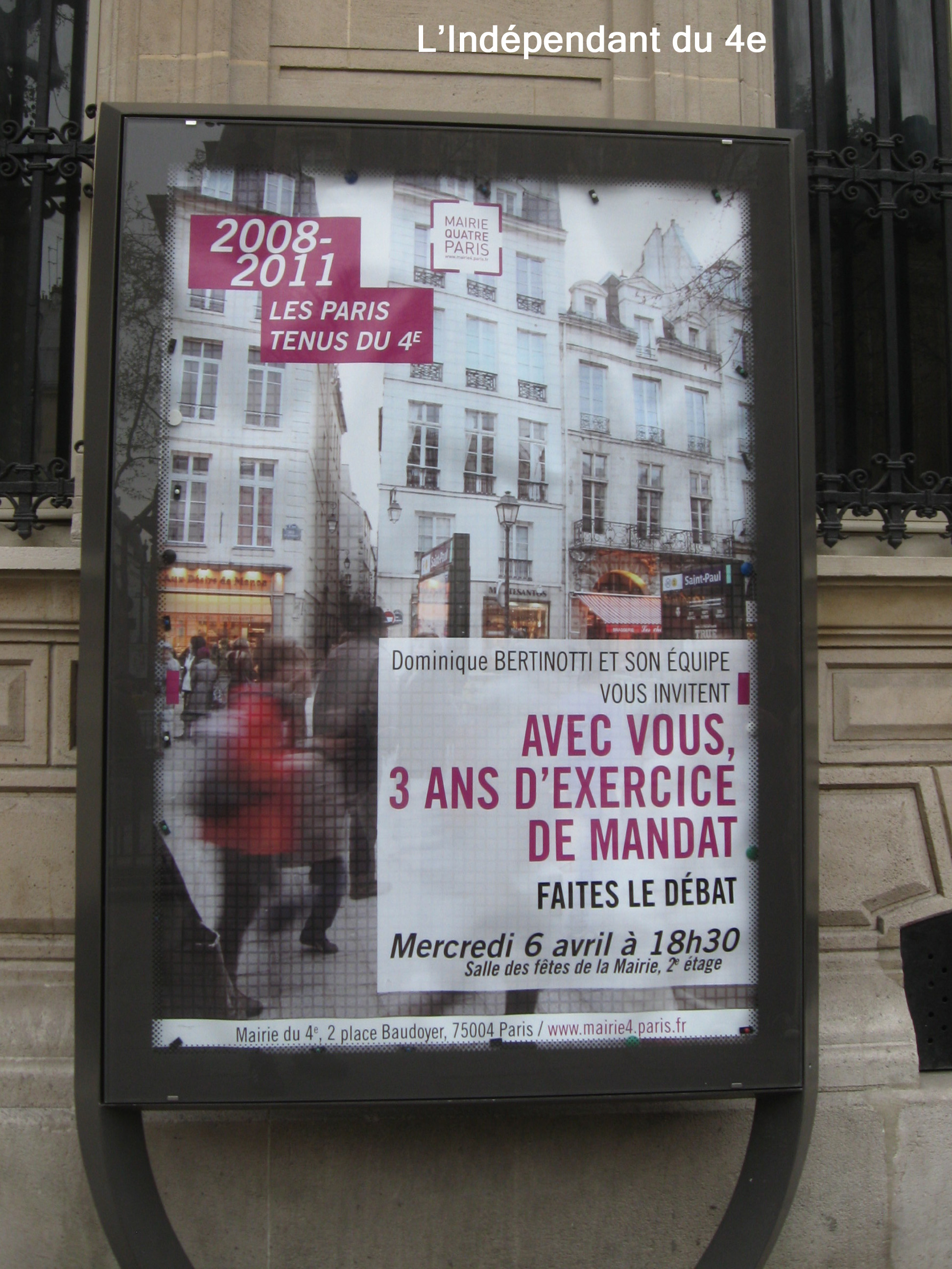 Madame la maire du 4e arrondissement, Dominique Bertinotti, et son équipe municipale dressent leur bilan ce soir lors d'un bilan participatif qui commencera à 18h30. Pour ceux qui sont bloqués chez eux ou qui ne sont pas dans le 4e arrondissement, voici l'affiche que l'on peut voir sur de nombreux panneaux d'affichage officiel de la mairie :