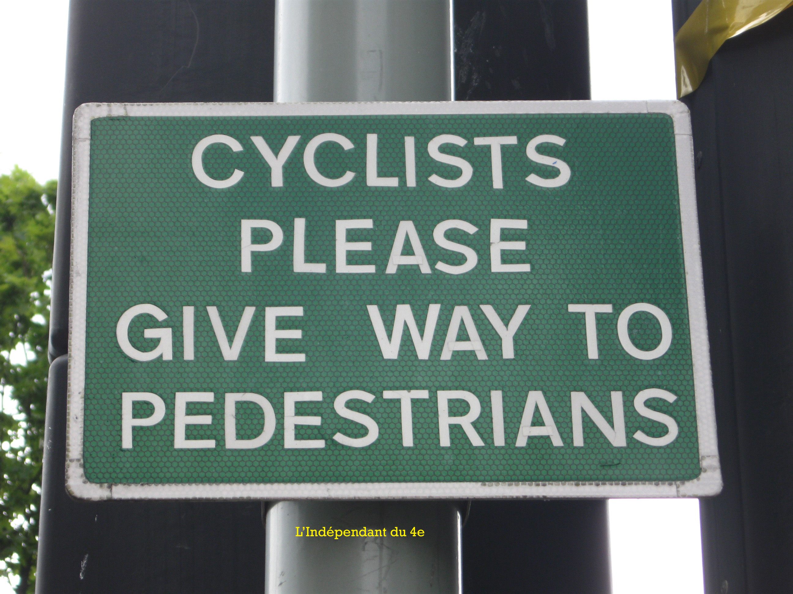 Je ne suis pas particulièrement fan de la mise en place à tous les coins de rues de nouveaux panneaux mais il faudrait que le message qui apparaît sur le panneau photographié ci-dessus soit davantage respecté par les cyclistes.