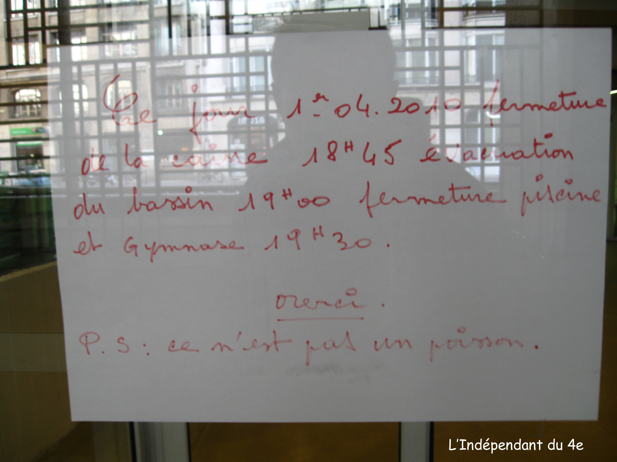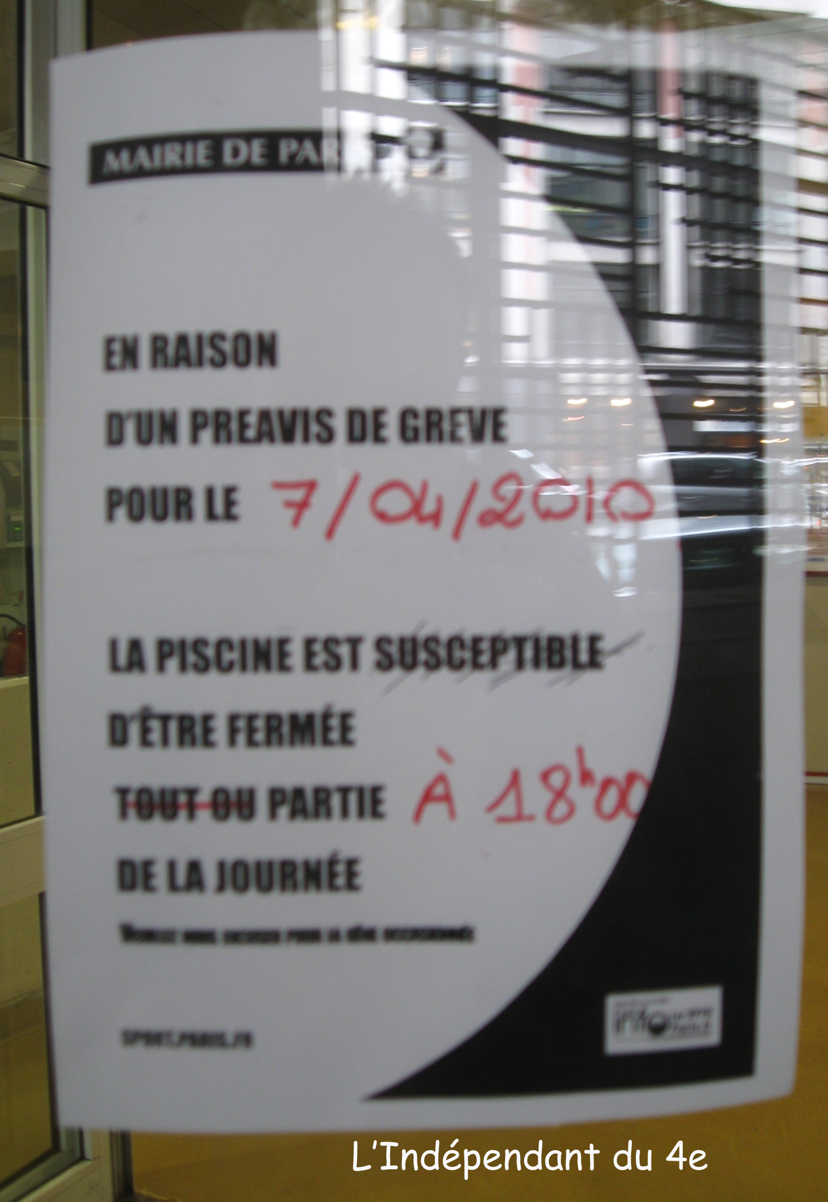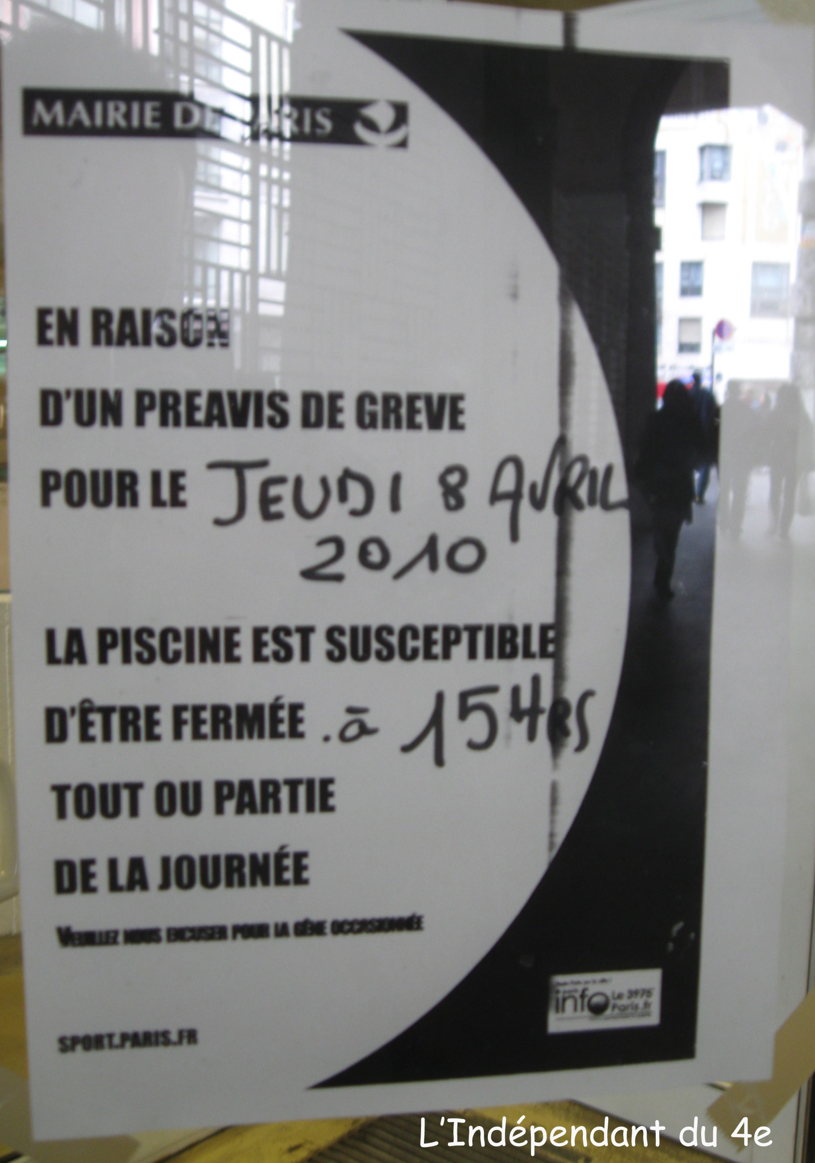 Il existe certes des possibilités de nager en quittant les arrondissement que je viens de citer (avec l'inconvénient majeur que cela crée une affluence énorme sur les établissements les plus proches). Voici pour suivre quelques pistes que je propose pour les habitants ou les visiteurs du 4e qui ont l'idée fort saugrenue de vouloir nager en ce début de l'été 2010 (et cela sans avoir à prendre les transports en commun). J'ai en effet vu cette semaine plusieurs nageurs qui, arrivés devant la porte close de la piscine Saint-Merri , torturaient leur plan de Paris pour essayer de comprendre où étaient les piscines ouvertes les plus proches. Voilà qui pourra peut-être les renseigner.
