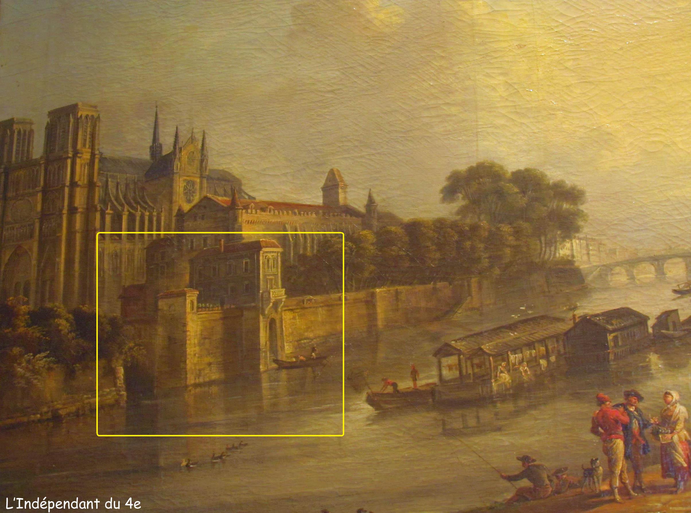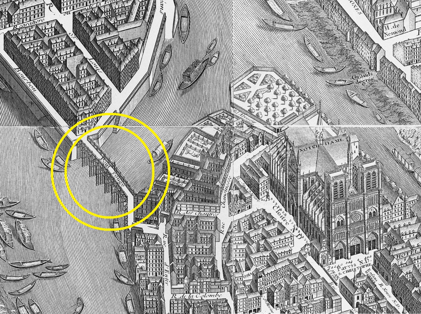 Cela permet d'avoir une idée de l'angle de vue de la gravure en situant les lieux à l'aide du plan Turgot : la vue est prise depuis la rive Gauche au niveau du quai de la Tournelle de telle façon que le spectateur puisse avoir la perspective entre les deux îles en regardant vers le Nord-Ouest :