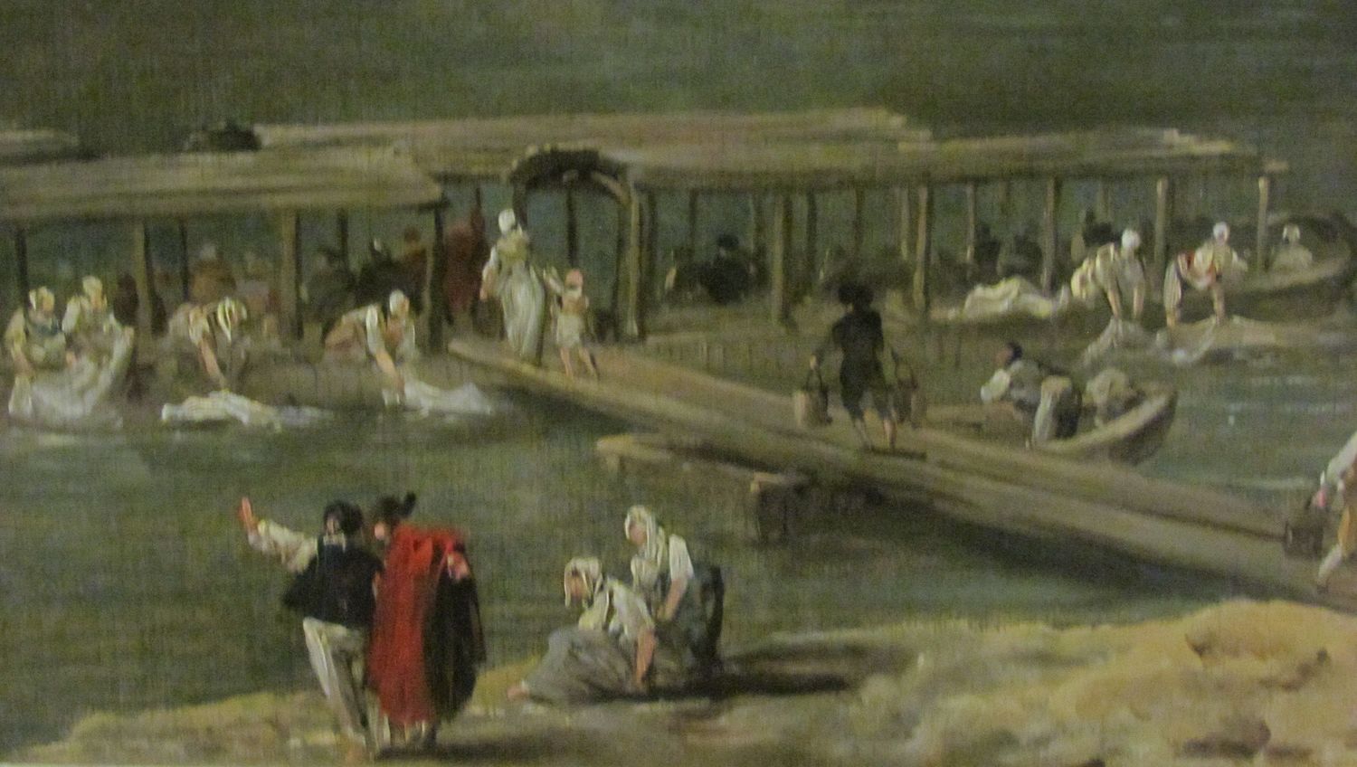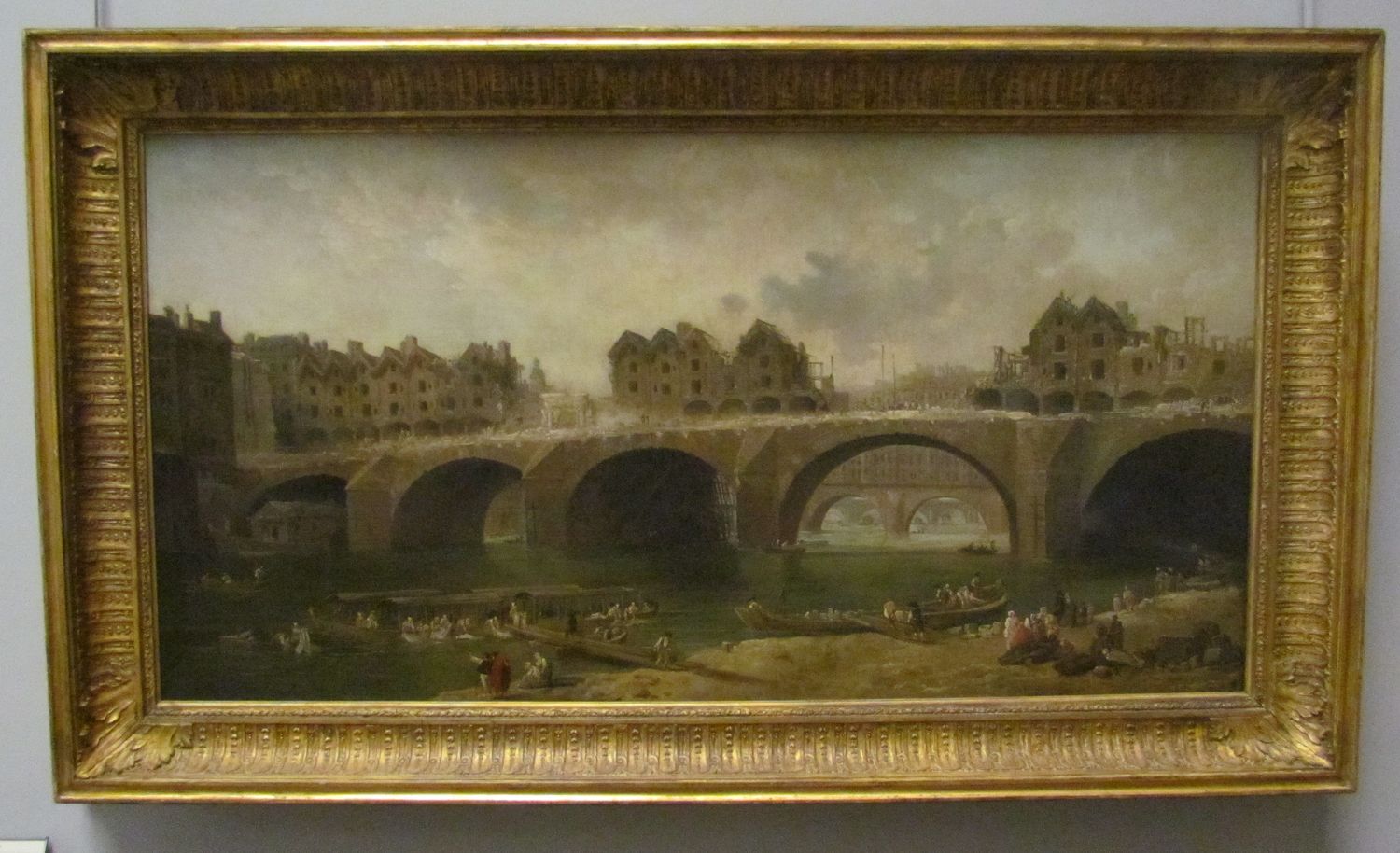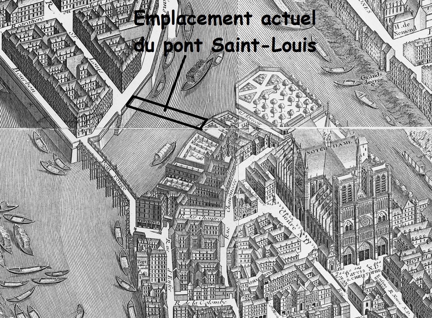 Pour se repérer, on peut utiliser le plan Turgot des années 1730. On voit que ce 1er pont du XVIIe siècle emporté par la débâcle de 1709, détruit en 1710 avait été remplacé par un pont construit exactement au même emplacement en 1717. A cause de sa peinture il était appelé le "Pont Rouge" :