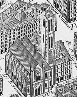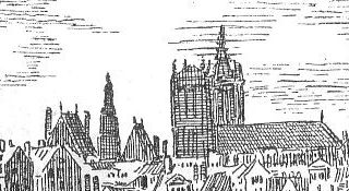 On comprend ainsi quelle église apparaît dans la partie DROITE de la Gravure car juste à gauche on voit aussi la silhouette de l'Hôtel de Ville :