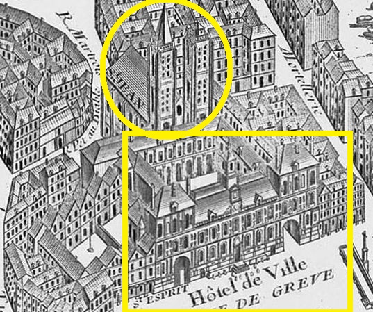L'église Saint-Jean-en-Grève se trouvait juste derrière l'Hôtel de Ville. Cette église a été détruite en 1797 et 1800. Son emplacement est aujourd'hui occupé par l'actuel Hôtel de Ville considérablement agrandi sous Louis-Philippe (et c'est pourquoi aujourd'hui, une grande salle s'appelle la salle Saint-Jean). Notons qu'il ne s'agit pas de l'actuel église Saint-Gervais-Saint-Protais qui est masquée par les bâtiments situés de l'Île Saint-Louis au 2e plan à droite.