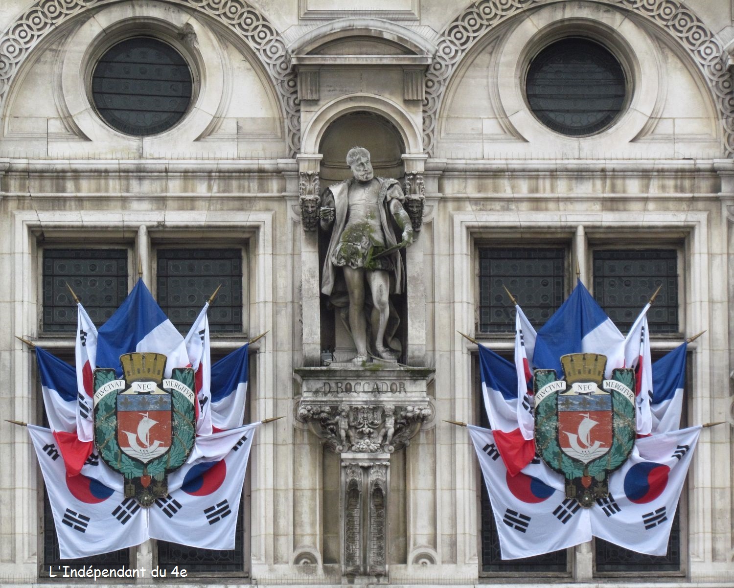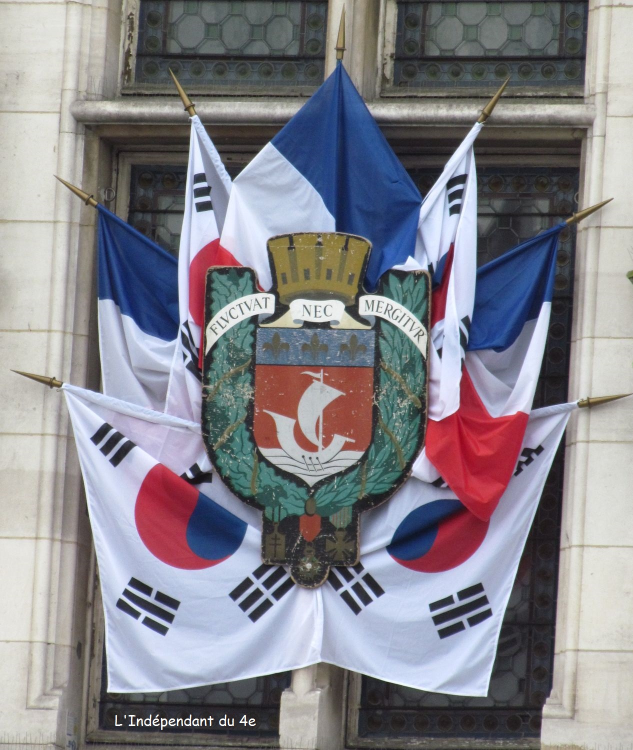 Ceux qui passent régulièrement devant l'Hôtel de Ville auront peut-elle remarquer que la semaine dernière la façade était pavoisée aux couleurs de la Corée du Sud. Cela donnait un très joli visuel puisque le bleu et le rouge que l'on peut voir au Centre du drapeau de ce pays ne sont pas sans rappeler les couleurs de Paris.