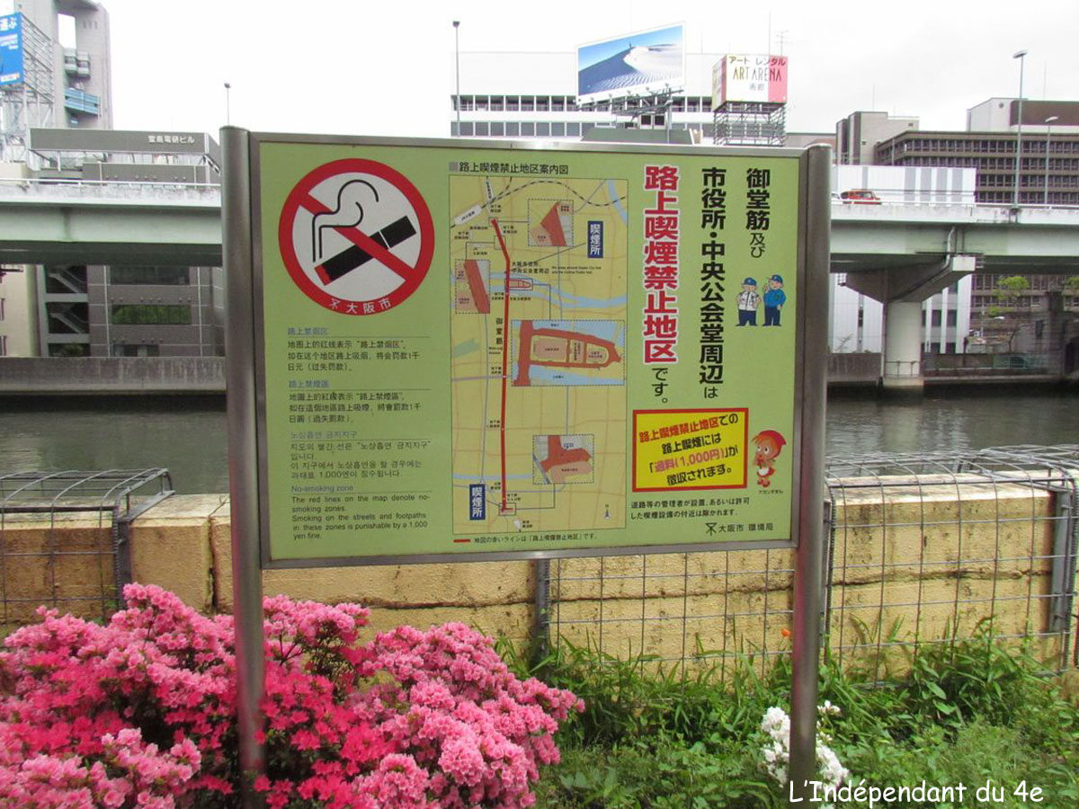 Des panneaux installés un peu partout indiquent la délimitation de l'espace non fumeur qui dans certains cas à une superficie non négligeable comme à Osaka :