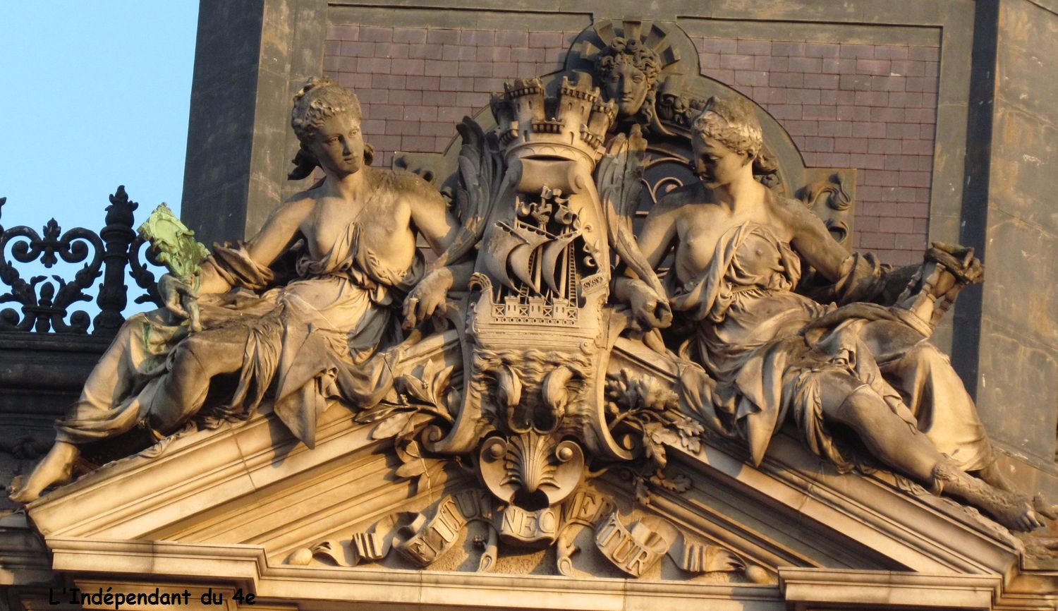 Sur la place de l'Hôtel de Ville, on trouve devant le portail central plusieurs statues. Parmi, elles, on peut voir celle-ci. Une femme très dénudée qui tient un compas dans la main droite et une tablette dans la main gauche.