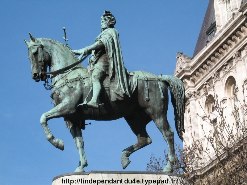 Durante mucho tiempo, “quai de l’Hôtel de Ville”, une gran estatua situada frente al “Hôtel de Ville” (el ayuntamiento de Paris) por el lado del muelle estaba oculta por arboles. La gran tempestad de 1999 tuvo por lo menos un merito: poder admirar, desde el Sena, a Etienne Marcel a caballo. Esto me permite evocar la triste historia de un dirigente de la Cuidad de Paris que soñaba con un destino nacional…